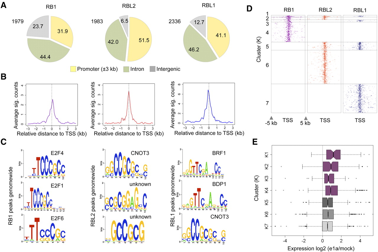 Analyses of RB-family protein genome-wide binding in contact-inhibited IMR90 fibroblasts. (A) Overview of RB1, RBL2, and RBL1 peak distributions in mock-infected cells in relation to gene structure are shown as pie charts. (B) Average binding profiles (significant counts) of the indicated RB-family members across the TSS regions of their respective target genes. (C) A 600-bp region around the peaks of RB1, RBL2, and RBL1 in mock-infected cells were analyzed for TF binding motifs using sitepro (Galaxy). Top three significant motifs for each family member are shown. All P-values are less than 1 × 10−10. (D) The distributions of the RB-family proteins across ±5 kb of TSS for genes with at least one RB-family member bound are shown as heat maps. The seven clusters are based on combinatorial binding patterns of the three proteins. (E) Relative gene expression changes of each of the seven clusters after e1a expression at 24 h p.i. are shown as box plots.