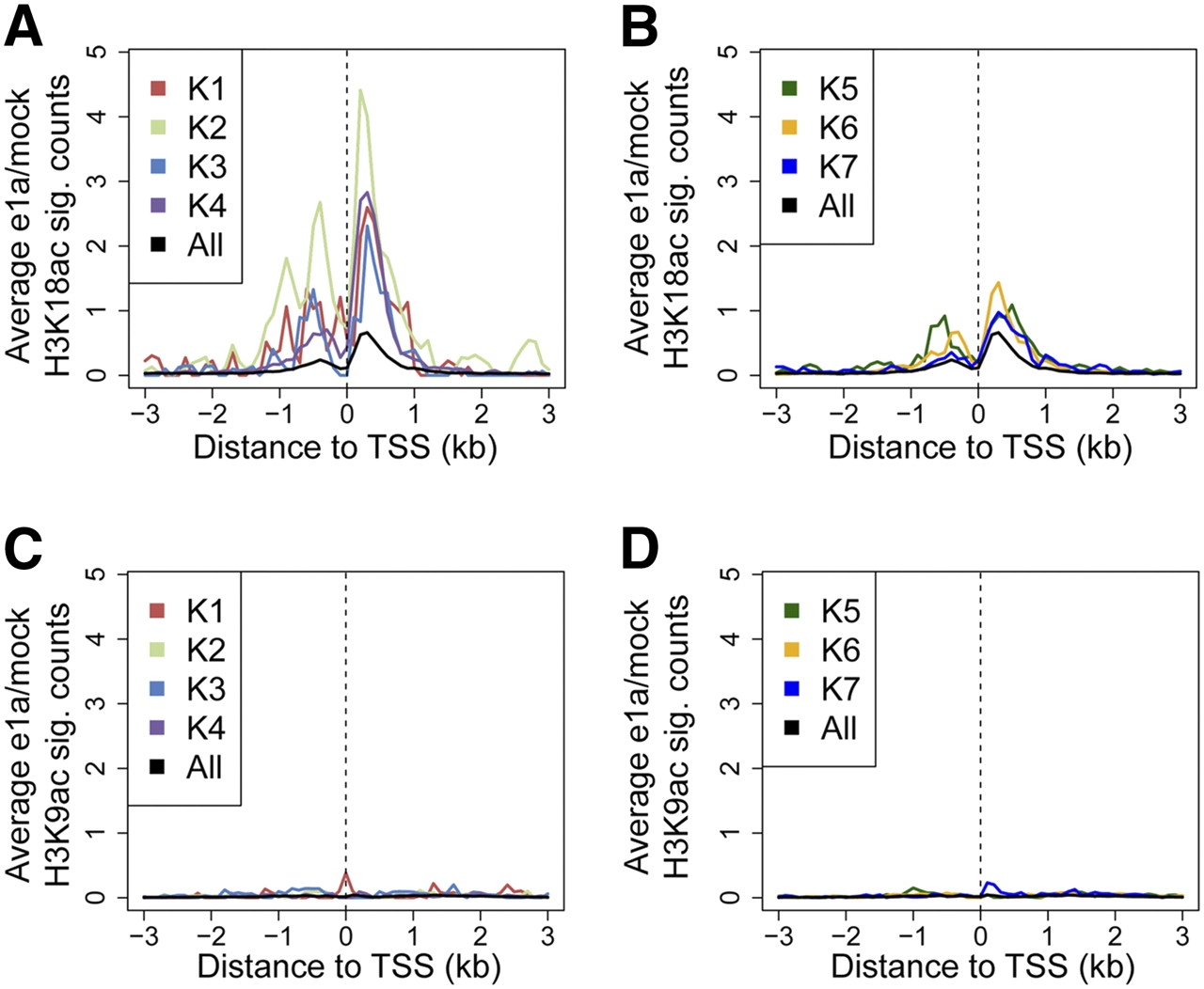 Relationship of the RB-binding clusters to histone acetylation change. (A,B) Average significant (sig.) counts of change in H3K18ac levels in dl1500- versus mock-infected cells are shown for the seven RB-clusters (see Fig. 3C). (C,D) Average significant (sig.) counts of change in H3K9ac levels in dl1500- versus mock-infected cells are shown for the seven RB-clusters (see Fig. 3C).