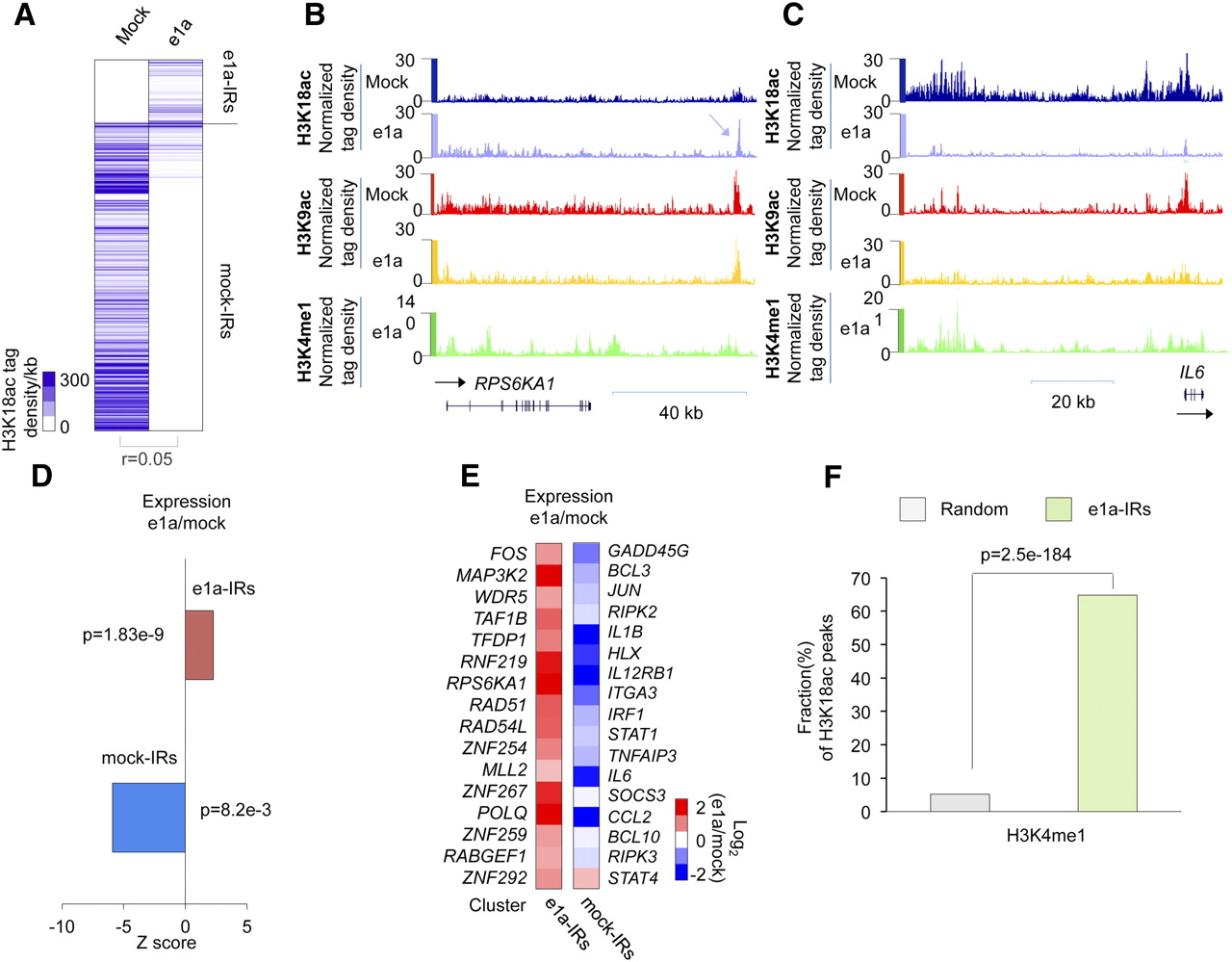 Intergenic peaks of H3K18ac coincide with potential distal regulatory elements to control gene expression. (A) The total H3K18ac tag density (number of sequence tags per kb) in intergenic regions (IRs) that are affected upon e1a expression is shown as a heat map. “Mock-IRs” and “e1a-IRs” are intergenic regions that harbor significant H3K18 acetylation in mock- or dl1500-infected cells, respectively. Distributions of H3K18ac, H3K9ac, and H3K4me1 in mock- and dl1500-infected cells around the RPS6KA1 (B) and the IL6 loci (C) are shown. (D) Relative gene expression changes of the e1a- and mock-IRs clusters after e1a expression at 24 h p.i. (E) Expression levels of candidate genes associated with e1a- and mock-IRs clusters are shown as heat maps. (F) Bar plot showing the fraction of H3K18ac peaks in the e1a-IRs that coincide with H3K4me1 in e1a-expressing cells.