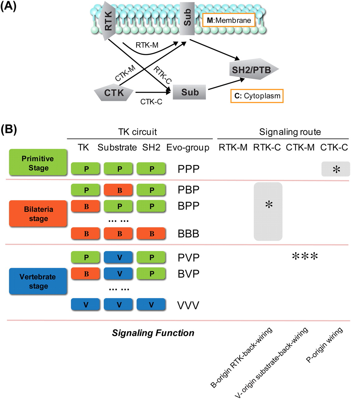 Evolutionary origins of tyrosine kinase (TK) circuits and signaling routes. (A) A diagram depicting the signaling routes for intracellular, inter- or extracellular, and tissue-specific communication via the TK circuits. A kinase or substrate may be a membranous or cytoplasmic protein. Depending on cellular locations of its components, a TK circuit may belong to one of the four signaling routes, namely, RTK-M, RTK-C, CTK-M, and CTK-C, where M and C denote membrane and cytoplasm, respectively. (B) Enrichment of different signaling routes at distinct evolutionary stages. TK circuits were divided into “evo-groups” according to the origins of the corresponding circuit components. The evo-group is used to assign the origin of a signaling route. The enrichment of a particular evo-group circuit in a signaling route provides information on the evolutionary origin of the latter. TK circuits of a particular origin that are enriched (P < 0.05) in a signaling route for both curated and predicted data sets were identified by gray rectangles with the significantly enriched evo-group identified by asterisks. Intracellular signaling (represented by the CTK-C signaling route) is significantly enriched with the PPP evo-group circuits (via the P-origin self-wiring path). Extracellular or intercellular signaling (represented by the RTK-C route) is significantly enriched with the BPP evo-group circuits in which newly evolved (B-origin) TKs “wire back” to ancient (P-origin) substrates (via the B-origin RTK-back-wiring path). In contrast, tissue-specific CTK-M signaling is enriched with PVP circuits that feature vertebrate-origin substrate wiring-back to ancient (P-origin) TKs and SH2 domain-containing proteins (via the V-origin substrate-back-wiring path). (*) P < 0.05; (***) P < 0.001, randomization test.