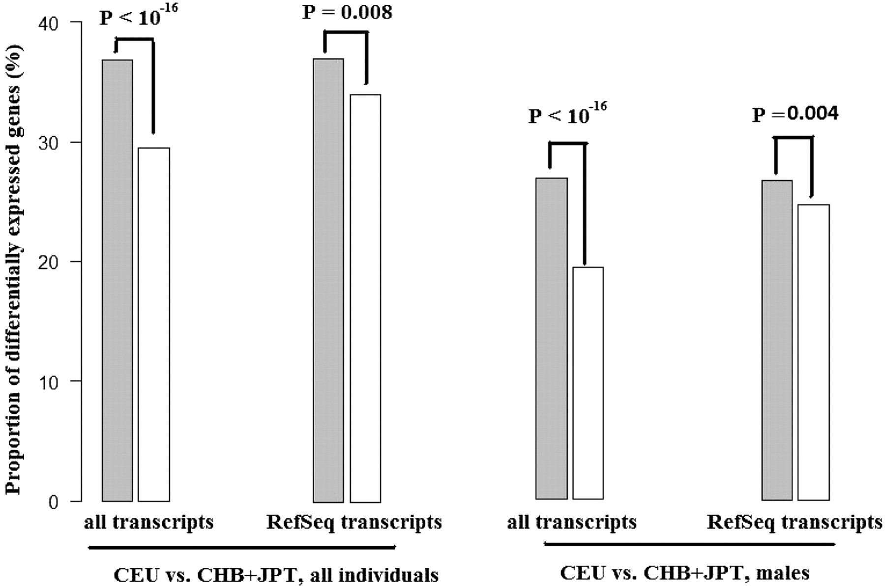 High-confidence miRNA target genes tend to display greater differential expression between CEU vs. Asian populations (FDR is cut off at 0.001). This pattern holds true either when we incorporate all of the probes or restrict our analysis to the RefSeq transcripts. Similar patterns were observed when we considered both genders, or males alone. High-confidence miRNA targets were considered as miRNA targets, while genes not targeted by coexpressed miRNAs in all of the six methods were considered non-targets (see legend to Fig. 2). (Gray) miRNA targets; (white) non-targets. When we only consider RefSeq transcripts, 3187 of 8660 (36.8%) miRNA target transcripts are differentially expressed, and 818 of 2421 (33.8%) non-target transcripts are differentially expressed (P = 0.007). For all of the expressed transcripts in males, 26.9% (2332 out of 8684) of targets are differentially expressed, and 19.4% (1080 out of 5560) of non-targets are differentially expressed (P < 10−16). For the RefSeq data in males, 25.6% (2217 out of 8660) of targets are differentially expressed, and 22.7% (550 out of 2421) of non-targets are differentially expressed (P < 10−16).