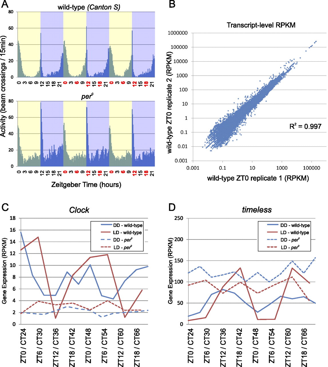 RNA-seq accurately measures circadian transcriptional rhythms. (A) Locomotor activity rhythms were monitored using an automated infrared beam-break apparatus in wild-type and per0 flies entrained to a 12 h:12 h light:dark (LD) environment (N = 32 flies for each experiment). Plots are histograms of beam-breaks binned at a 20-min resolution. At the times indicated in red, brains were dissected and total RNA was purified for amplification and RNA-seq analysis. (B) Raw RNA-seq reads were aligned to the reference fly genome and transcriptome using the RUM read mapping algorithm, and expression levels (presented as reads per kilobase per million reads, RPKM) were calculated. Transcript expression levels exhibit a high degree of reproducibility between biological replicates with R-squared values on the order of 0.99. Expression profiles for Clock (C) and timeless (D) show consistent patterns of circadian oscillation in wild-type brains (solid lines) as measured by RNA-seq. Period-null mutation (dashed lines) disrupts the normal circadian rhythmicity of each of these transcripts. Clock and timeless oscillate in both LD (red) and DD (blue) with expected phases, and their amplitudes are damped in DD relative to LD, also as expected. The x-axis labels show the Zeitgeber time (ZT) for LD experiments and circadian time (CT) for wild-type Canton-S flies in DD.