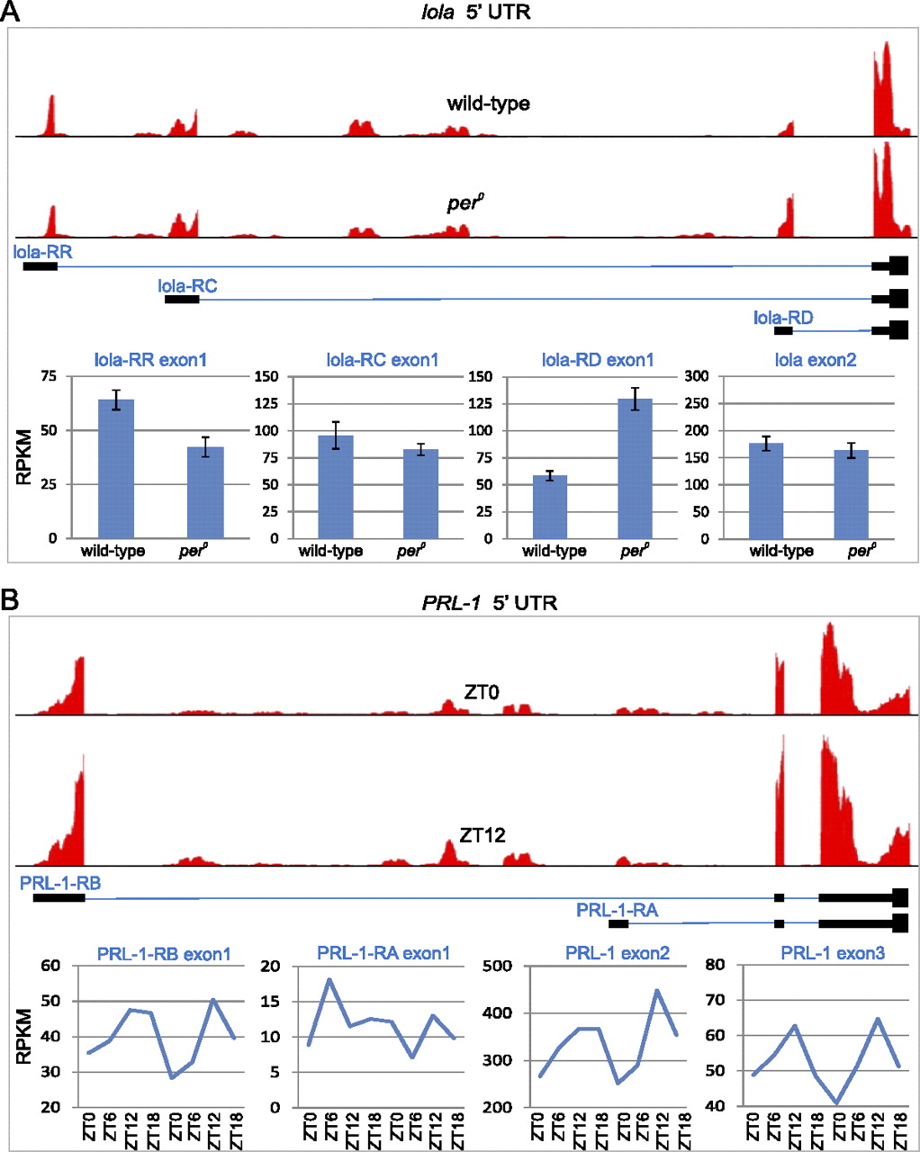 Examples of alternative splice isoforms regulated by per loss-of-function and time-of-day. The 5′ UTR and nearby coding exons are shown for lola (A) and PRL-1 (B). (Solid black bars) Exons; (blue lines) introns. (Red histograms, top) The depth of sequencing coverage for wild-type and per0 samples (lola) or ZT0 and ZT12 (PRL-1). Bar graphs or line graphs show the expression levels of individual exons (bottom).