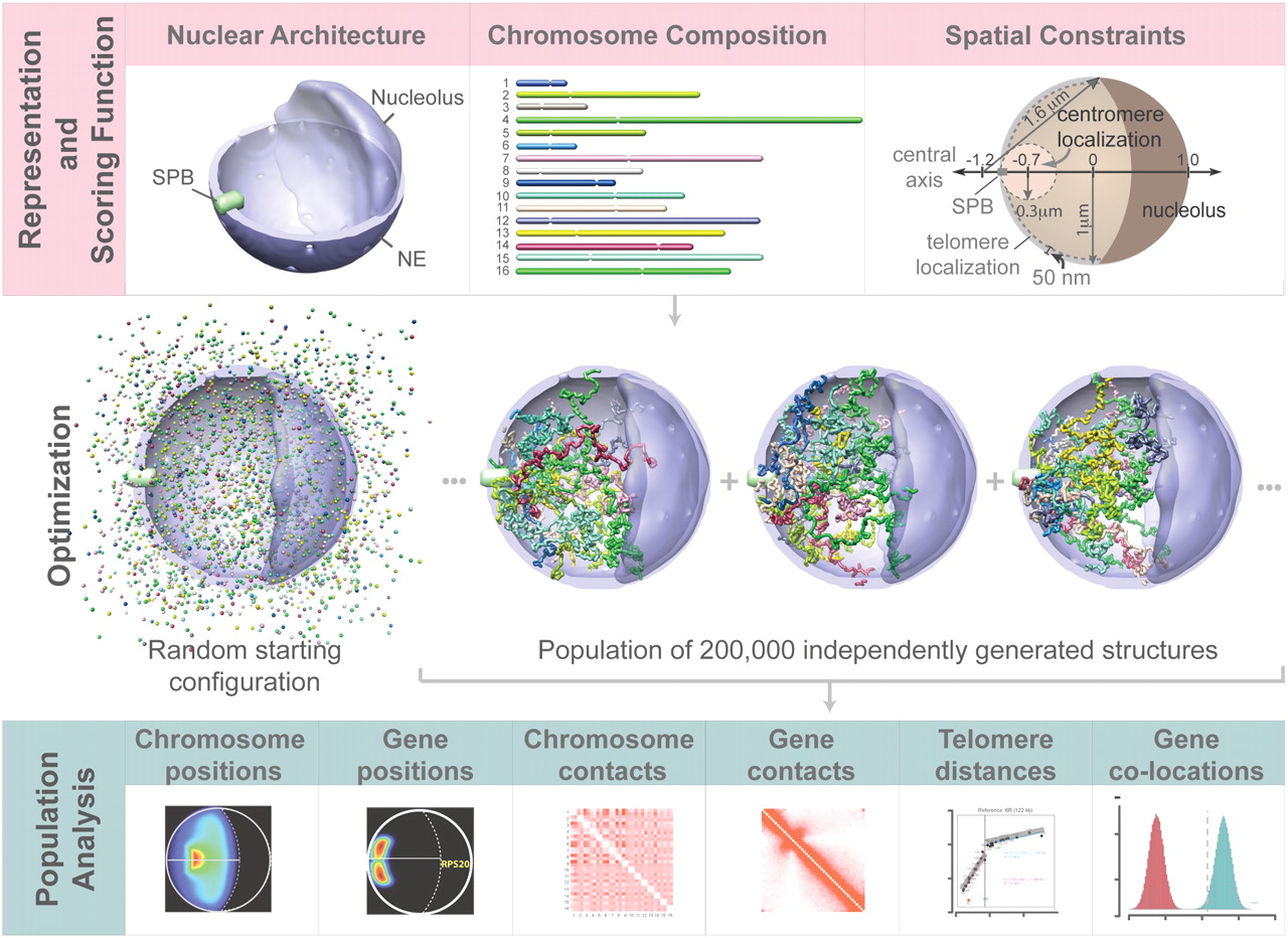 Population-based analysis of the S. cerevisiae genome organization. To analyze structural features of the genome, we defined an optimization problem with three main components. (Top panels) A structural representation of chromosomes as flexible chromatin fibers (center), a structural representation of the nuclear architecture (left), and the scoring function quantifying the genome structure's accordance with nuclear landmark constraints (right). (Middle panels) An optimization and sampling method, which minimizes the scoring function to generate a population of genome structures that entirely satisfies all landmark constraints. (Bottom panels) The statistical analysis and comparison of structural features from the population of 3D genome structures with all the experimental data.