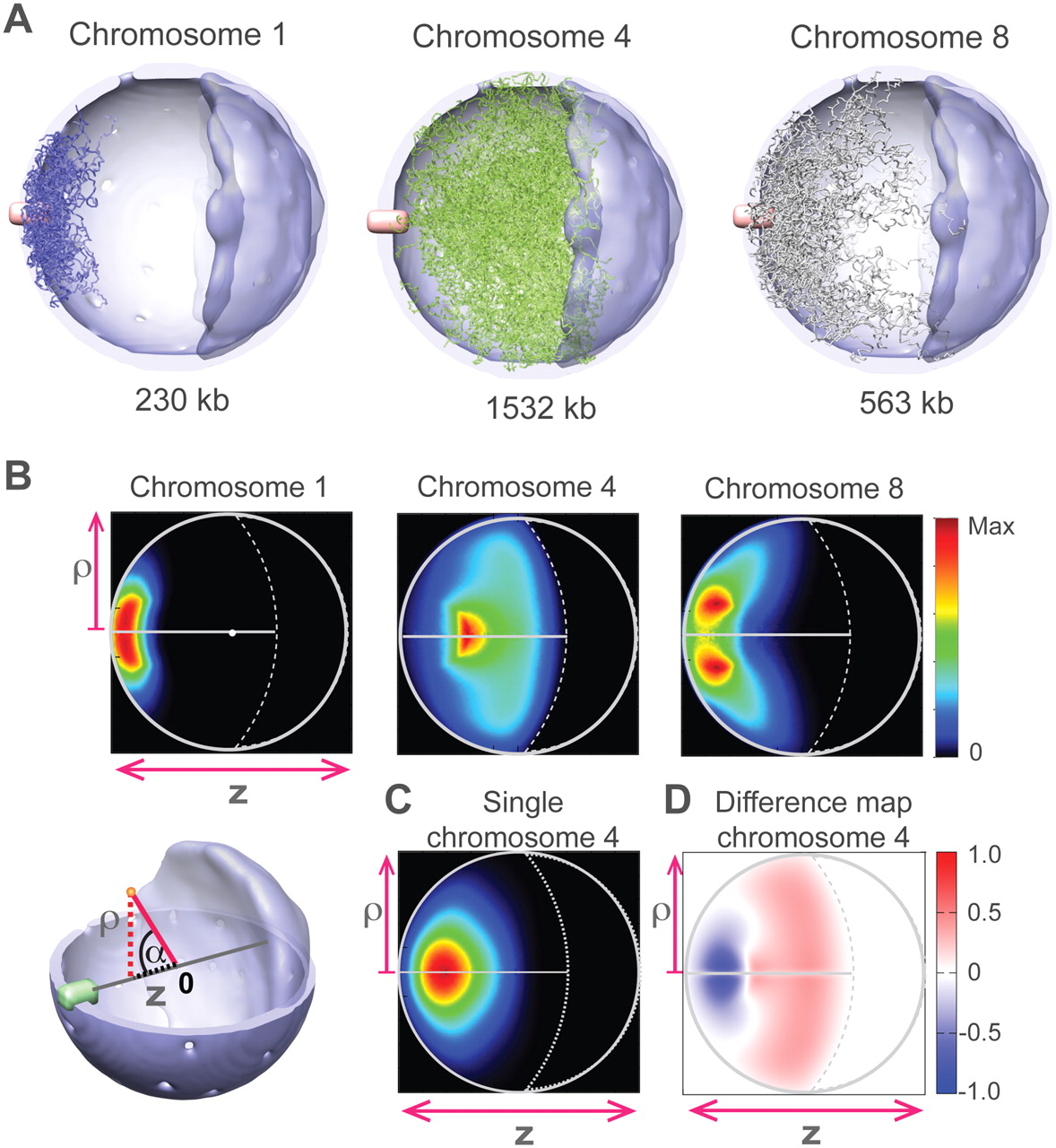 Chromosome locations. (A) A sample of 40 chromosome configurations randomly selected from the structure population for the small chromosome 1 (left panel, blue chains), the large chromosome 4 (middle panel, green chains), and the medium-sized chromosome 8 (right panel, gray chains). The chain thickness is reduced to enhance visibility. The chromosomes are depicted in the nucleus with the SPB in pink, the nucleolus in dark blue, and the NE in light blue. (B, top) Chromosome localization probability densities (LPDs) of chromosomes 1 (left), 4 (middle), and 8 (right panel) plotted along the two principal axes ρ and z (Supplemental Material). (Lower left) Reference frame for projecting the positions of chromosome points onto the two principal axes, namely, the projection along the central axis z (connecting SPB, nuclear center, and nucleolus), and the radial distance ρ-axis indicating the absolute distance of a point from the central axis. (C) The LPD of chromosome 4 resulting from the “single chromosome population.” The chromosome is subject to all landmark constraints, but structures are generated without the presence of other chromosomes in the nucleus. The density distribution is significantly different from the situation when all chromosomes are present (see B). (D) Excluded volume effect. The difference map between the LPDs of chromosome 4 from the structure population when all chromosomes are present (B, middle) and the single chromosome population as defined in C.