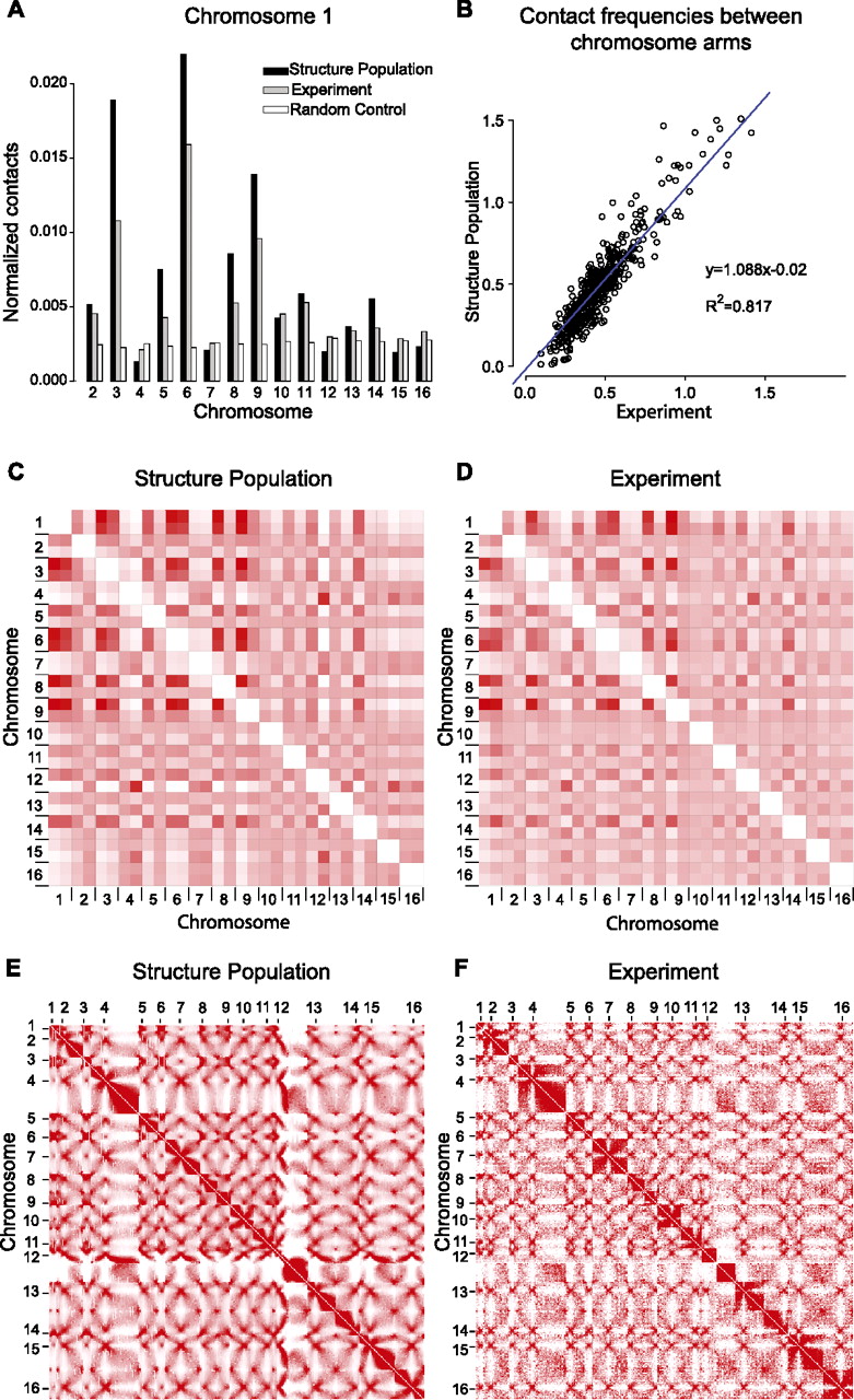 Chromosome and gene loci interactions. (A) Histogram of the normalized contact frequencies of chromosome 1 with other chromosomes in the structure population (black bars), chromatin conformation capture experiments (gray bars) (Duan et al. 2010), and the random control population (white bars). Contact frequencies of other chromosomes are shown in Supplemental Fig. 2. (B) Comparison of chromosome-arm–chromosome-arm contact frequencies from the structure population and experiments (Duan et al. 2010). (C,D) Contact frequency heat maps for chromosome arm contacts in the structure population (C) and experiments (D) (Duan et al. 2010). Heat maps of the genome-wide contact frequencies between loci at 32-kb resolution determined from the structure population (E) and in a chromosome conformation capture experiment (F) (Duan et al. 2010). (Color code ranges from white for low to red for high values.) Centromere positions are marked by the ticks. The row-based average Pearson's correlation between the two heat maps is 0.94 (all P-values <10−6). The largest differences between both heat maps involve interactions to the small arm of chromosome 12, which is not surprising because it contains all of the rDNA genes located in the nucleolus, which are not explicitly treated in our simulation. To further improve these interactions it is necessary to include these regions in future simulations (see Supplemental Material).