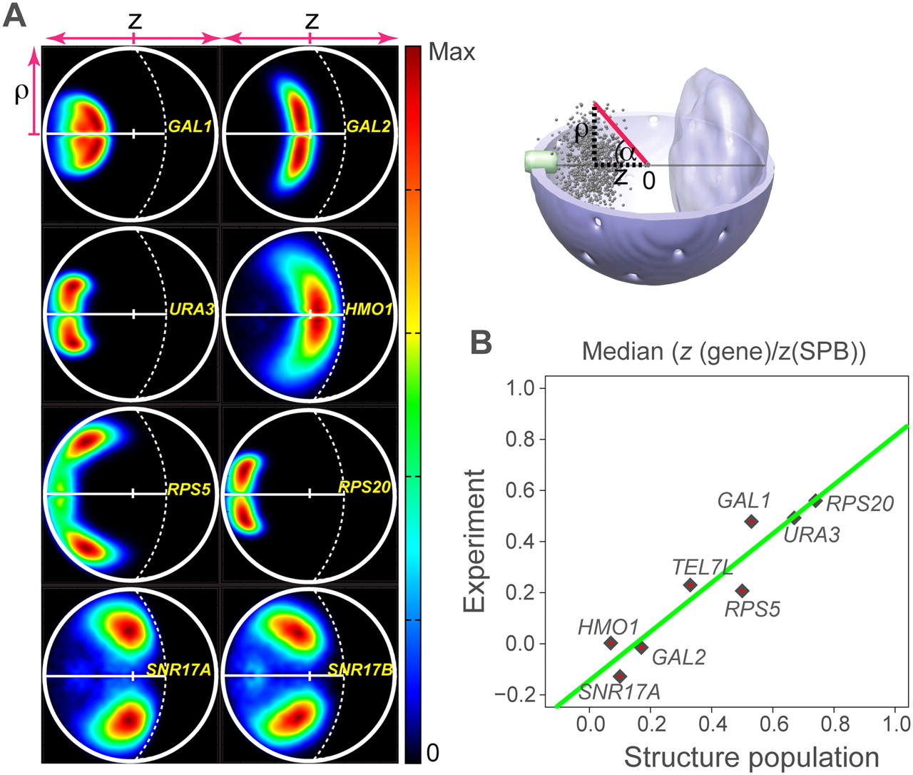 Gene territories. (A) Projected localization probability densities for the positions of eight gene loci in the structure population. The probability densities are determined with respect to two principal axes of the nuclear architecture (top right panel). The z-axis connects the SPB with the origin at the nuclear center and the nucleolus. The radial axis ρ defines the distance of a point from the central axis (top right panel). The lower half of the projected localization density plot is mirrored from the top half for visual convenience. (B) Median gene loci position along the z-axis calculated from the projected probability localization densities in A and from the experiment (Berger et al. 2008). The two are highly correlated with R2 = 0.9. To allow for comparison with the experiment, the z-axis distance of a gene locus is normalized relative to the SPB–gene distance.