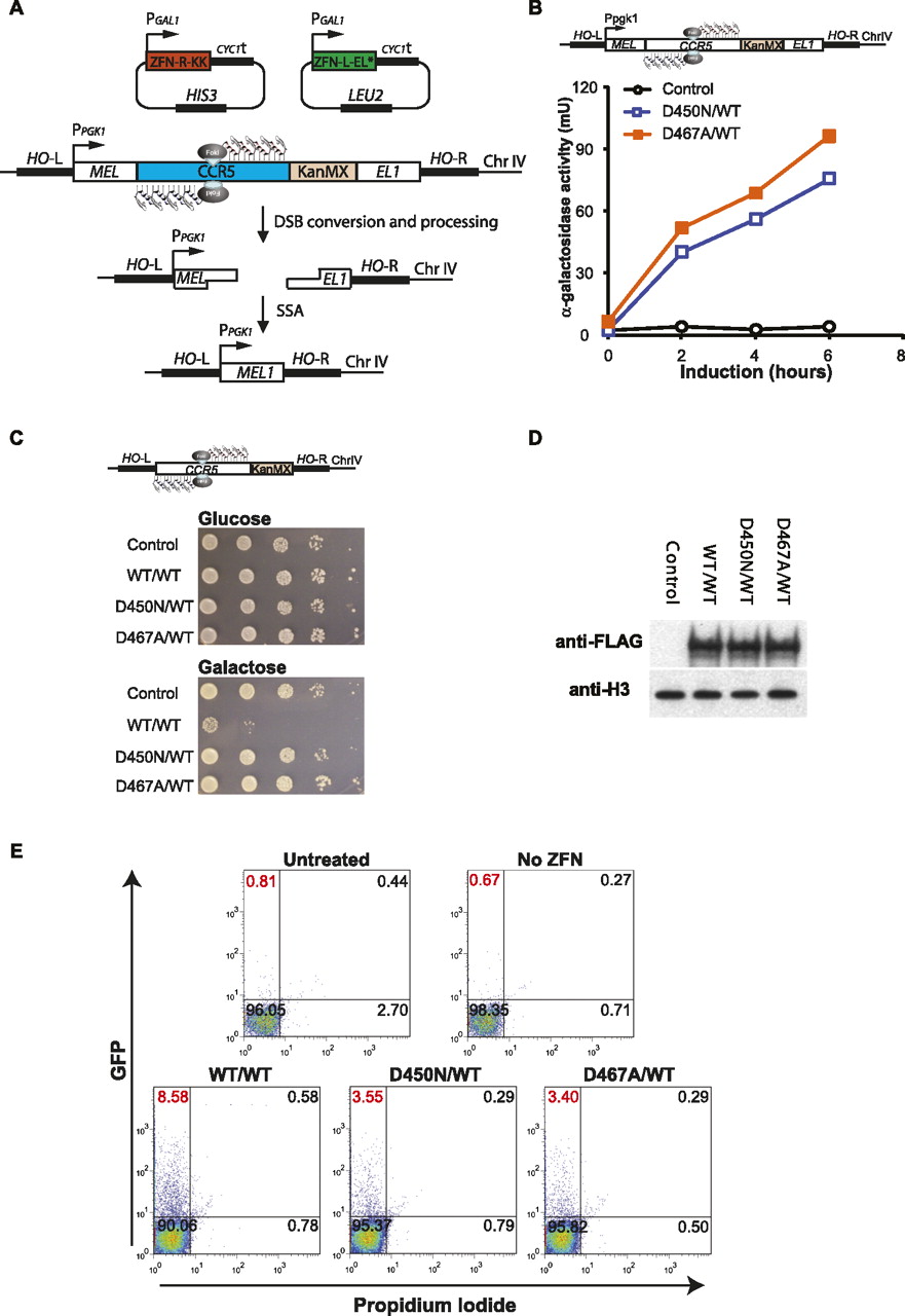 Targeted nicks stimulate homologous repeat deletion. (A) Illustration of the MEL1 reporter assay. A MEL1 reporter yeast strain, carrying the CCR5 ZFN target site introduced between two overlaping fragments of the MEL1 gene (MEL and EL1, respectively), was transformed with ZFN expression plasmids for ZFN-L-EL ([*] catalytically inactive FokI domain) and ZFN-R-KK, whose expression are under the control of galactose-inducible promoter (PGAL). ZFN expression was induced by the addition of galactose to the growth media and a DNA break or nick generated (depending on the constructs used). The repaired MEL1 gene directs the expression of α-galactosidase that can then be measured to determine the relative efficiencies of DNA break- or nick-induced repair. (CYC1t) Transcriptional terminator of CYC1 (cytochrome c1) gene, (HIS3) the gene encoding yeast imidazoleglycerol-phosphate dehydratase required for histidine biosynthesis, (LEU2) the gene encoding yeast beta-isopropylmalate dehydrogenase (IMDH) required for leucine biosynthesis; HIS3 and LEU2 are used for selection of transformants, (PPGK1) promoter of the phosphoglycerate kinase 1 (PGK1) gene, (KanMX) dominant resistance module for selection of S. cerevisiae transformants against geneticin (G418) (Voth et al. 2001). (B) Induction of a targeted nick in yeast stimulates homologous repeat deletion and restoration of the reporter gene (MEL1). ZFN expression was induced for 2 to 6 h, and reporter activity was determined as previously described (Doyon et al. 2008). (C) Evaluating direct double-strand DNA cleavage activity of the ZFNickases in yeast. A haploid yeast strain harboring the CCR5 ZFN target site integrated into the HO locus was transformed with the indicated galactose-inducible ZFNickase expression plasmids (D450N/WT, D467A/WT), DSB-inducing ZFN vectors (WT/WT), or a no ZFN control (Control). Tenfold serial dilutions of each cell line were plated on minimal media containing either glucose (ZFN expression off) or galactose (ZFN expression on) and incubated for 3 d. Direct DSB-induction results in a severe reduction in yeast cell viability (compare WT/WT+Glucose with WT/WT+galactose). No loss of viability is observed with the nickases. (D) Western blot to assess the expression levels of the various ZFN variants in panel C. Aliquots of the ZFN-induced cultures were harvested after 6 h of galactose induction. Cell lysates were run on SDS-PAGE, transferred, and blotted with either an anti-FLAG monoclonal antibody (Sigma) to detect FLAG-tagged ZFN or anti-H3 monoclonal antibody (Millipore) as loading control. No significant differences in ZFN expression were observed. (E) Induction of a targeted nick in mammalian cells stimulates homologous repeat deletion mediated restoration of reporter gene expression. K562 cells were either untreated or transfected with a GFP reporter DNA plasmid (Supplemental Fig. S1) in the absence (No ZFN) or presence of the indicated ZFN expression plasmids. Cells were collected 3 d post-transfection and subjected to flow cytometry analysis after a 5-min incubation with propidium iodide (PI) to stain nonviable cells (PI+). GFP+PI− cells (gate at top left) represent the number of viable cells which have restored marker gene expression. One representative example from three independent experiments is shown.