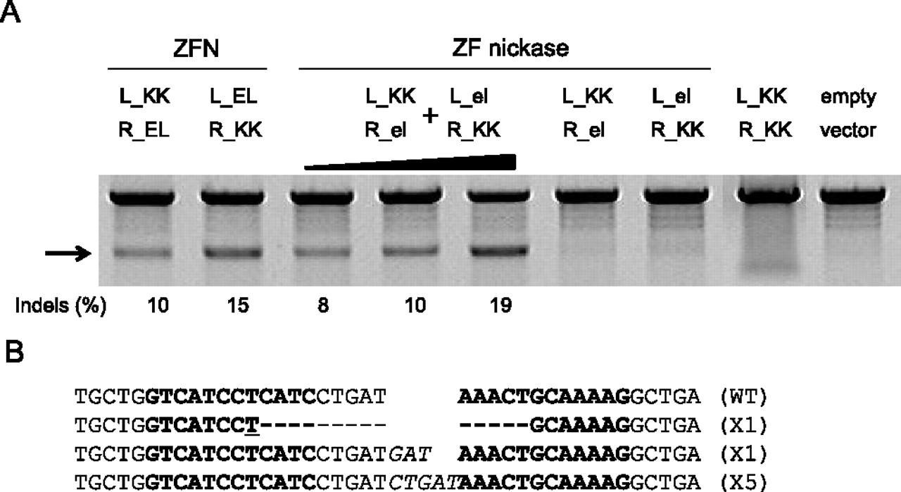Two pairs of ZF nickases produce a DSB in the genome. (A) Nuclease or nickase-driven indels detected by T7E1 assay. PCR products amplified using genomic DNA from cells transfected with plasmids (4 μg/monomer) encoding nickases or nucleases were subjected to T7E1 digestion and analyzed by agarose gel electrophoresis. (Arrow) The expected position of the resulting DNA band. (The black triangle above the gel picture) The increase of the transfected plasmid (4, 8, and 10 μg/each monomer). (B) DNA sequences of the CCR5 wild-type and mutant clones. The two half-sites are shown in boldface letters. Microhomologies are underlined, and inserted bases are shown in italics. Dashes indicate deleted bases. The number of occurrences is shown in parentheses; X1 and X5 are the number of each clone. (WT) Wild type.