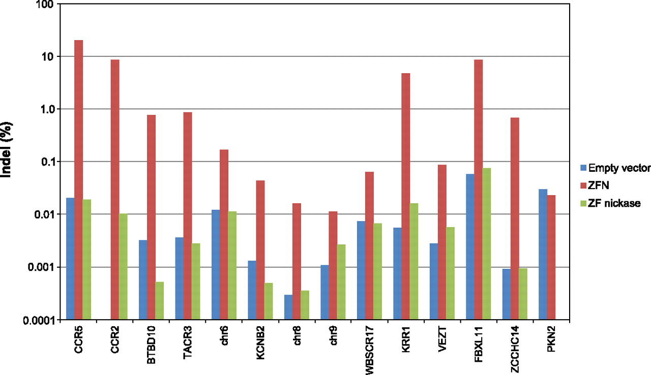 Mutagenic NHEJ frequencies at on-target and off-target sites. K562 cells were transfected with plasmids encoding ZFN-224, the ZF nickase (L_KK/R_el), or an empty vector used as a negative control. PCR amplicons corresponding to the CCR5 on-target site and 13 off-target sites were subjected to high-throughput sequencing. Sequences that contained indels within the spacer region were considered to be NHEJ-mediated modifications.