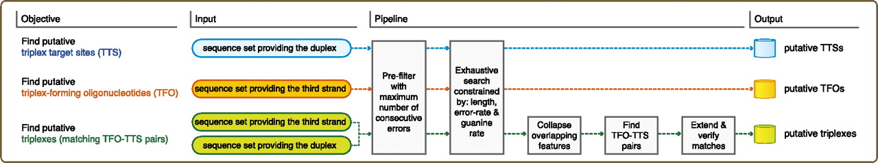Diagram of the implemented pipeline. Triplexator searches for either putative TTSs in a set of duplexes, putative triplex-forming oligonucleotides in a set of single-strand sequences, or the matching pairs from both sets that are able to form nucleic-acid triple helices.