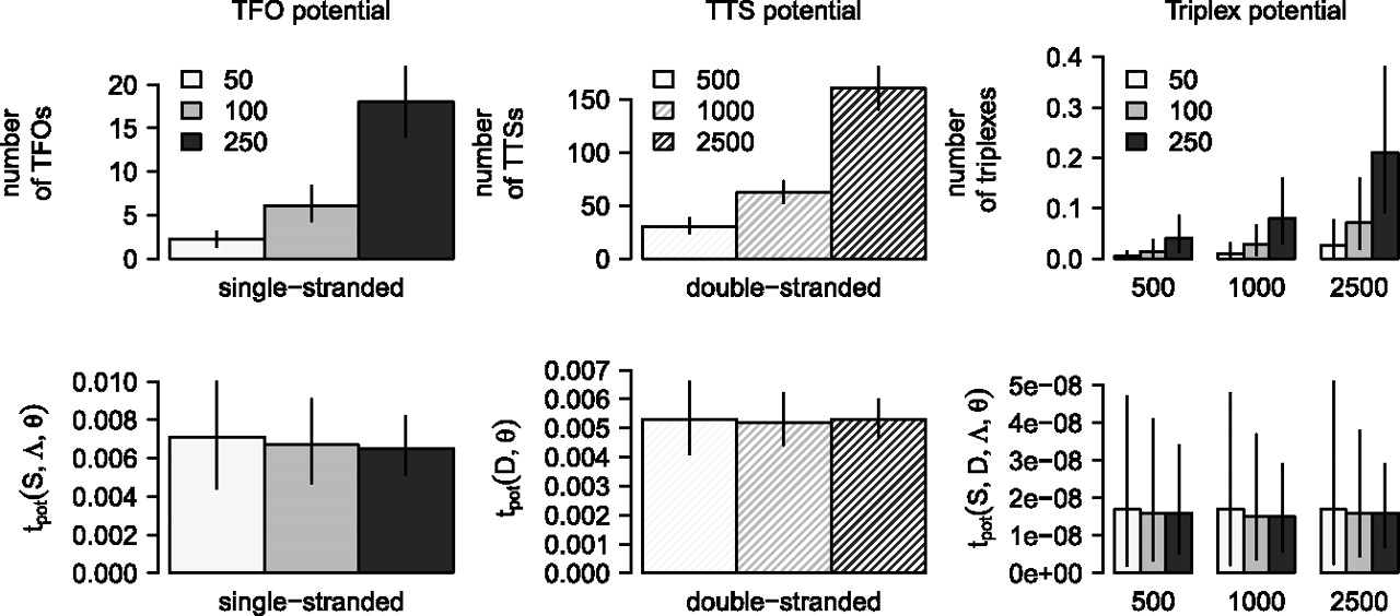 Effect of sequence length normalization using random data. The plots show the accumulated triplex potential of single-stranded sequence sets (left), double-stranded sequence sets (middle), and between both sets of sequences (right) either counting the number of triplex features (upper panel) or using a length-adjusted scoring scheme (lower panel) with lines indicating the 90% confidence intervals. All sequence sets are derived from the same 107 nucleotide sequence but partitioned into sets of varying length distribution as indicated by the mean sequence length m ∈ {50, 100, 250} for single-stranded and m ∈ {500, 1000, 2500} for double-stranded sequence sets.