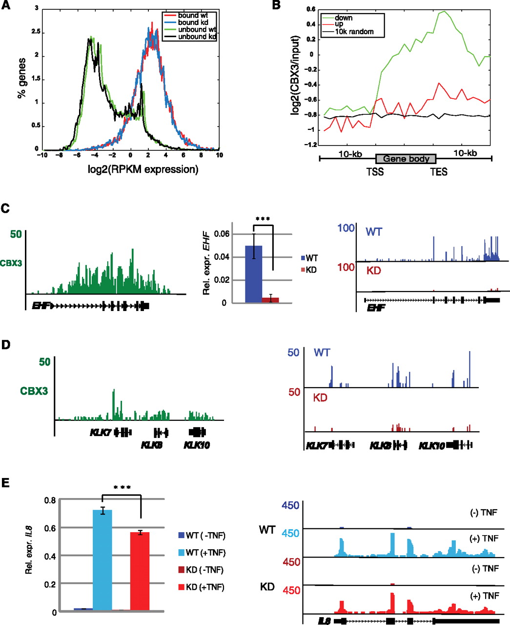 CBX3 target genes are down-regulated in KD HCT116 cells. (A) Comparison of Log2 (RPKM expression) profiles for genes in KD and WT cells, grouped as either bound or unbound by CBX3 (in WT cells). Bound WT red line, bound KD blue line, unbound WT green line, and unbound KD black line. (B) CBX3 enrichment, from WT cells, for genes up- or down-regulated in CBX3 KD HCT116 cells. Log2 CBX3 (IP/input), from CBX3 ChIP-seq in WT HCT116 cells, binned as in Figure 1B with random regions as a control. (C, left) ChIP-seq UCSC Genome Browser snapshot of CBX3 enrichment at the EHF gene. (Middle) RT-qPCR analysis of EHF expression in WT and KD HCT116 cells. (Right) RNA-seq UCSC Genome Browser snapshot of EHF expression level in WT and KD cells. (D, left) CBX3 binding. (Right) RNA-seq browser shot (as in C) for KLK gene cluster. (E, left) RT-qPCR analysis of TNF-responsive CBX3 target IL8 in KD and WT HCT116 cells treated ± TNF for 30 min. (Right) UCSC Genome Browser snapshot of RNA-seq IL8 expression. RT-qPCR expression levels normalized to GAPDH and are the average of three biological replicate experiments. Error bars calculated as the standard deviation between replicates. (***) P ≤ 0.001.