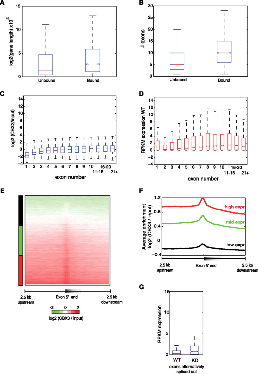 CBX3 binds to longer, exon-rich genes. (A) Box plot of Log2(gene length) of CBX3 bound or unbound genes in WT HCT116 cells. P = 4.77 × 10−283. (B) Box plot of median exon number for CBX3 bound and unbound genes. P = 1 × 10−300. (C) Box plot of CBX3 enrichment, log2 (CBX3/input), for genes grouped by exon number from 1 to 21+. (D) Box plot showing RPKM expression, in WT cells, of genes grouped by exon number from 1 to 21+. (E) Heatmap of CBX3 enrichment 2.5 kb upstream of and downstream from TSS distal exons in WT HCT116 cells. Signal normalized to input and targets clustered by exon expression from lowest to highest. (F) Average CBX3 enrichment at high (red), middle (mid-green), and low (black) third expressed exons. (G) Comparison of RPKM expression for alternatively spliced exons (alt out) in WT and KD cells. P-value for “alt out” exon in WT versus KD 2.771 × 10−15. For box plots, the median is represented by the center line; the edges of the box represent the 25th and 75th percentiles; and the whiskers extend to non-outlier extreme data points. P-values obtained using the Wilcoxon rank sum test.