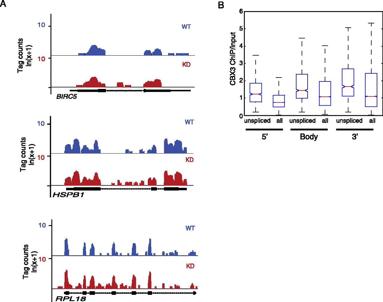 Loss of CBX3 causes RNA processing defects genome-wide. (A) UCSC Genome Browser snapshots showing representative RNA-seq data of CBX3 target genes BIRC5, HSPB1, and RPL18. Expression tag counts in ln(x + 1) scale. Gene schematic showing exons (filled black box) and introns (hashed lines) below tracks. (B) ChIP-seq CBX3 enrichment (IP/input RPKM) at 5′end, coding region, and 3′ end of genes having increased intron inclusion (unspliced) in KD versus WT HCT116 cells as compared to average CBX3 enrichment for all genes. Expression of introns and exons analyzed by RNA-seq in WT and KD cells. For box plots, the median is represented by the red line, the edges of the box represent the 25th and 75th percentiles, and the whiskers extend to non-outlier extreme data points.
