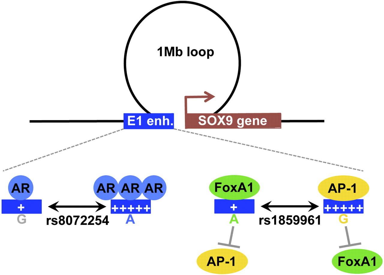 Model for the functional SNPs rs8072254 and rs1859961. The E1 enhancer within the 17q24.3 risk locus loops to the SOX9 gene. Within the E1 enhancer, the variant A allele of rs8072254 increases the binding of AR and further drives the increased enhancer activity. The variant G allele of rs1859961 decreases the binding of FOXA1 but increases the binding of AP-1. This latter increases enhancer activity. This E1 enhancer establishes a loop with the SOX9 genes in prostate cancer cells.