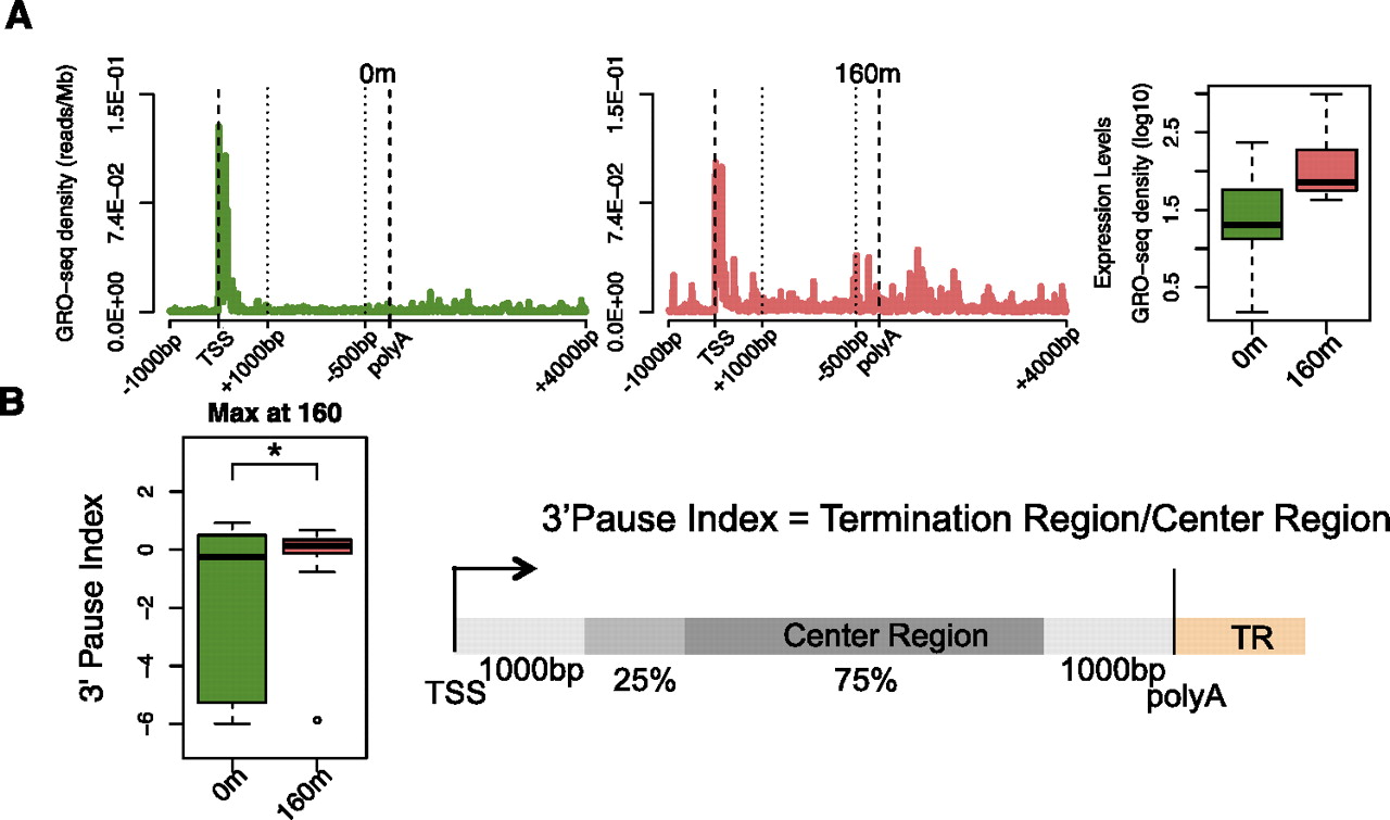 Accumulation of RNAPII at the 3′-end of genes is a dynamic process. (A) Average GRO-seq profiles for 31 estrogen-responsive genes that show maximal up-regulation at 160 min after treatment (Hah et al. 2011). To show the average profiles across genes, a “metagene” profile was plotted. The 5′ end [1 kp upstream of the transcription start site (TSS) to 1 kb downstream] and the 3′-end [500 bp upstream of the poly(A) site to 4 kb downstream] are unscaled. The remainder of the gene is rescaled to 2 kb. The boxplot depicts the expression levels. (B) The 3′ PI was calculated as shown in the schematic using unscaled GRO-seq tag counts from individual genes in each group. The 3′ PI values are significantly different between untreated (green) and estrogen-treated cells (red) as depicted by the boxplots.