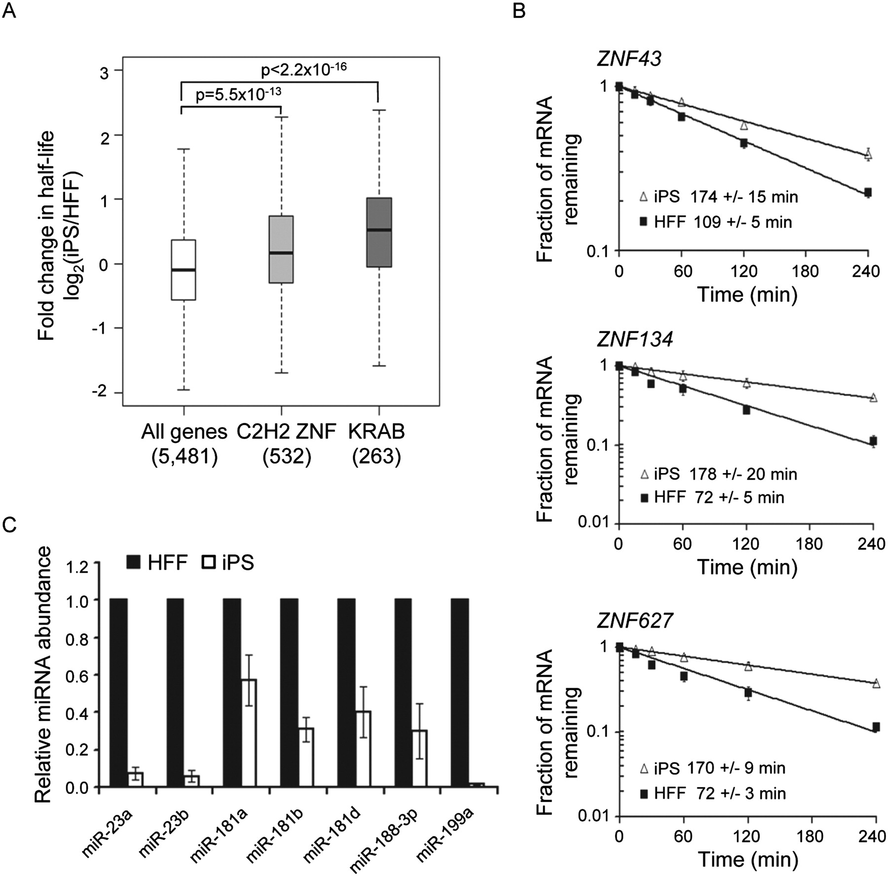 KRAB C2H2-type zinc finger protein mRNAs are stabilized in iPS cells. (A) Box-and-whisker plot showing fold change in half-life between HFF and iPS cells for different subsets of transcripts. (All genes) The entire data set of 5481 mRNAs; (C2H2 ZNF) 532 transcripts linked with the SMART term C2H2 ZNF (SM00355); (KRAB) 263 transcripts associated with the SMART term KRAB (SM00349). P-values were derived by the Kolmogorov-Smirnov Test. (B) Graphs showing decay of ZNF43, ZNF134, and ZNF627 mRNAs in HFF and iPS cells following inhibition of transcription with actinomycin D. mRNA abundance at each time point was determined by qRT-PCR. The error bars denote standard deviation based on three replicates. (C) Graph showing abundance of ZNF-targeting miRNAs in HFF and iPS cells as measured by qRT-PCR. Error bars represent the standard deviation derived from three independent experiments.
