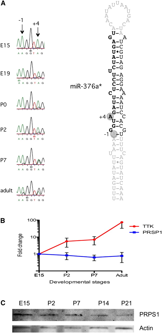 Editing of miR-376a redirects targeting during development. (A) Editing of pri-miR-376a at six different developmental stages. RNA from whole mouse brain was amplified by RT-PCR and sequenced. The different developmental stages used for sequencing are as indicated. (Arrows) Edited positions. (B) RNA from whole mouse brain at four different developmental stages (E15, P2, P7, and adult) was amplified by RT-PCR, and mRNA levels of TTK and PRPS1 were analyzed by qPCR. All error bars represent the SEM. (C) Protein levels of PRPS1 during development of the mouse brain. Immunoblot analysis showing PRPS1 protein expression during developmental day E19, P2, P7, P14, and adult. An anti-actin antibody was used as loading control.