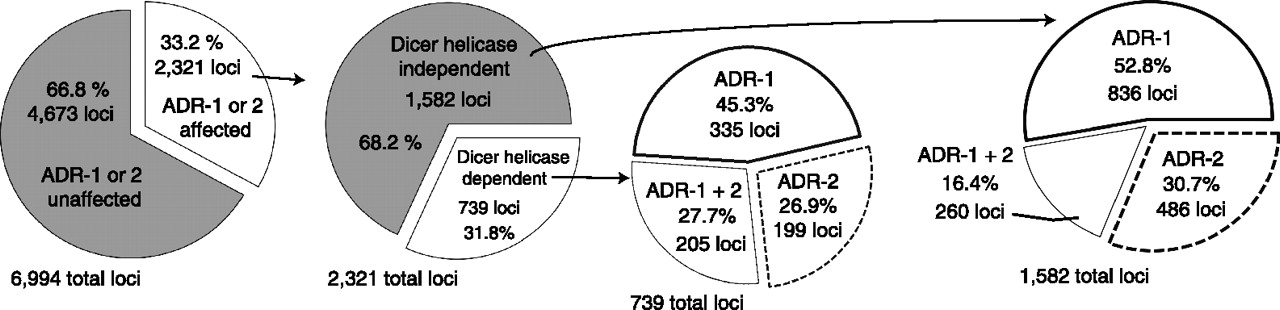 Overview of endo-siRNA loci affected by ADARs. (Pie charts) Number and percent of loci affected by different ADARs or Dicer's helicase domain. Loci affected in both adr-1(−/−) and adr-2(−/−) are abbreviated ADR-1 + 2.