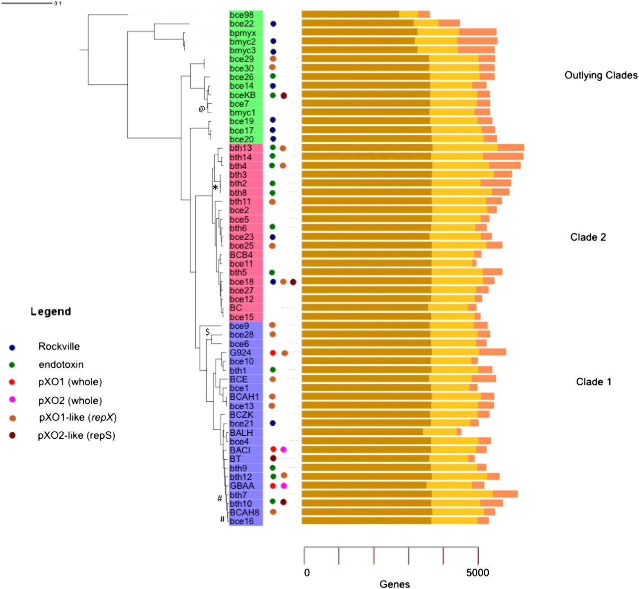 Whole-genome phylogeny of B. cereus s.l. The phylogenic tree was constructed from a data set of concatenated, conserved protein sequences using the neighbor-joining (NJ) algorithm implemented by PHYLIP (Felsenstein 1989). The tree was rooted using the known outlier B. cereus subsp cytotoxis. The scale measures number of substitutions per residue. Tree topologies computed using maximum likelihood and parsimony estimates are identical with each other and the NJ tree (see Supplemental Data). We performed 1000 bootstrap replications to test the topology of the tree, and all branches were supported by >50% of the trials. All branches with a bootstrap value of >0.9 are labeled with the following codes: 0.8–0.9; “$”; 0.7–0.8, “#”; 0.6–0.7 “@”; 0.5–0.6 “*”. If not labeled, support was >0.9. Labels refer to the genome codes listed in Table 1. Clades 1 and 2 and the outliers are labeled with blue, red, and green strips, respectively. Circles are opposite genomes containing whole pXO1 (red), pXO2 (fuchsia), or δ-endotoxin genes (green) or were isolated on the same day from Rockville, Maryland (blue). We have also indicated genomes likely containing pXO1-like (brown) or pXO2-like (burgundy) plasmids based on the presence of the RepX (Anand et al. 2008) or RepS (Tinsley et al. 2004) proteins, respectively. Each genome has a bar graph showing the proportion of genes belonging to core (brown), character (ocher), and accessory (pink) classes. All unfinished genomes sequenced in this project can be readily identified because they have three-letter lowercase species identifiers. The only other unfinished genome is G9241. Figures 1 and 2 were drawn using online Interactive Tree of Life (iTOL) software (Letunic and Bork 2007).