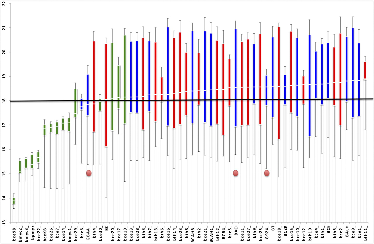 ANOVA analysis for pairwise inverse dN/dS for each genome. The figure shows the results of an ANOVA analysis performed to compare the mean pairwise dN/dS ratios estimated for each of the genomes. The whiskers of each data point box are the minimum and maximum values, and the solid boxes are the 25%–75% percentile ranges. The color of boxes indicates the clade of the genomes (blue, clade 1; red, clade 2; green, clade 3). (Horizontal line) Overall mean of inverse of all the mean pairwise dN/dS ratios (17.94). (Red circles) The three pXO1-containing strains.
