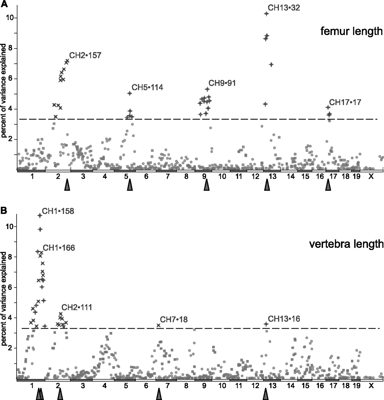 Genome-wide analysis of femur and vertebra length. For each genotyped locus, the display shows the percent of the total measured population variance explained (R2 × 100). (Horizontal dashed line) The genome-wide significance level of P < 0.05. (Crossed symbols) The individual loci reaching significance. In each statistically significant genomic region, the locus with maximal effect is labeled with the chromosome number and distance from the centromere, in megabase pairs (Mb, triangle). (A) Loci associated with right femur length (N = 454). (B) Loci associated with caudal vertebra (C8) length (N = 468). In both panels, (circles) maternal-informative loci (BALB/cJ vs. C57BL/6J alleles); (squares) paternal-informative loci (C3H/HeJ vs. DBA/2J alleles).