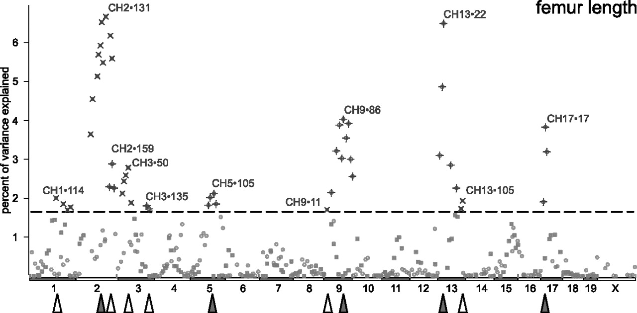 Analysis of combined synthetic populations for femur length. Femur length measures, derived from two separate experimental cohorts, analyzed as a single combined population (N = 832; 454 initial population, 378 replicate population). (Horizontal dashed line) The genome-wide significance level of P < 0.05. (Crossed symbols) The individual loci reaching significance; (open triangles) the genomic locations of loci identified in the initial synthetic population; (filled triangles) loci identified in the combined analysis.