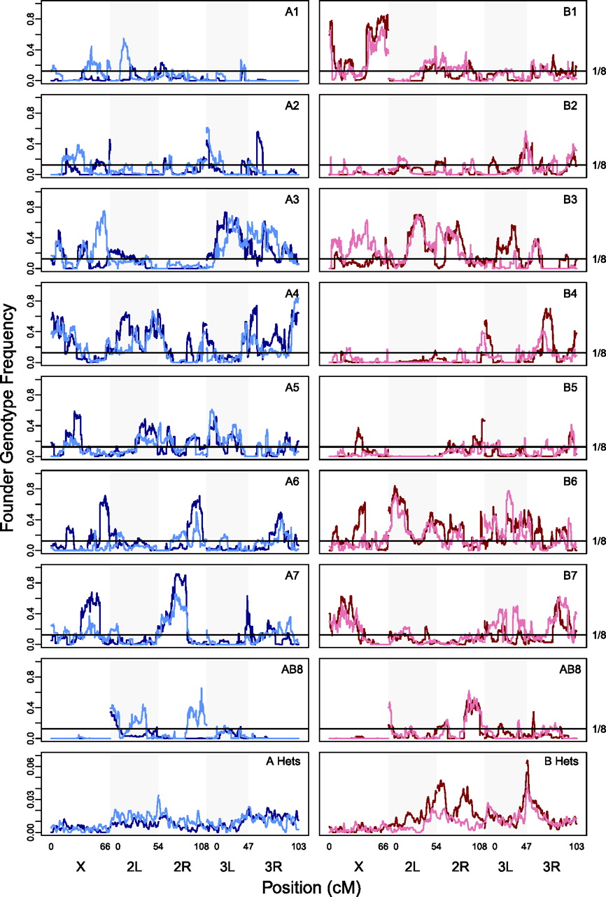 Founder genotype frequency variation across the genome in the DSPR RILs. The first eight rows show the frequency of each homozygous founder genotype in the pA (pA1, dark blue; pA2, light blue) and pB (pB1, dark red; pB2, pink) DSPR RILs. The 1/8 line shows the expected frequency for equal founder composition. The bottom row shows the frequency of heterozygous genotypes (note the y-axis scale is considerably reduced for these plots).