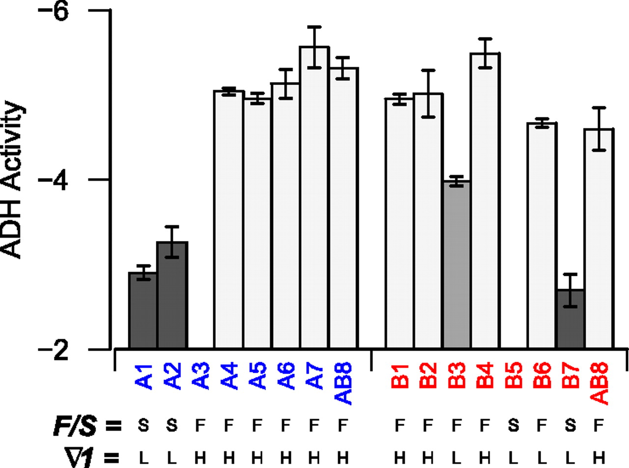 Founder haplotype means at the major Adh-associated QTL from the analysis of the raw ADH activity data. Founders are shaded to highlight the three major phenotypic classes identified by our phasing heuristic, and below are the genotypes of the founders at F/S and ∇1.