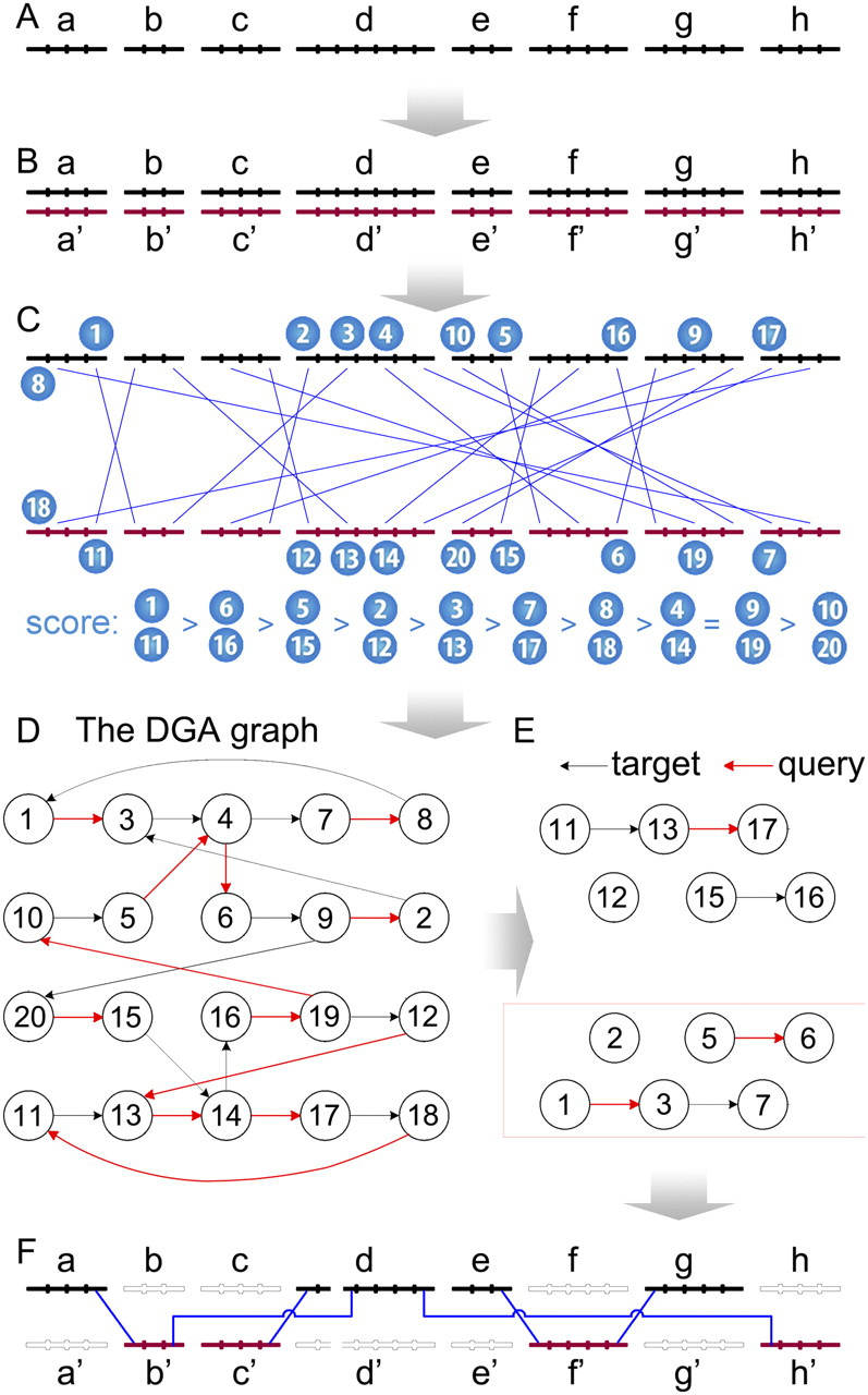A schematic diagram showing the DGA graph-based procedure. This diagram shows how to reconstruct allelic relationships and create the reference haploid assembly for a tiny diploid polymorphic assembly with eight scaffolds. The original diploid assembly (A), is first duplicated into two copies (B); then whole-genome pair-wise alignments are created between two assemblies (C). Based on the alignments, a DGA graph is created (D), from which a reduced linearized DGA graph is subsequently derived (E); guided by the reduced DGA graph, a reference haploid assembly can finally be created (F). This assembly has been included in the HaploMerger package as a simple example for testing. Readers may refer to Supplemental Figure S2 for more details regarding the conversion from the initial complicated DGA graph (D) into the reduced linearized DGA graph (E).