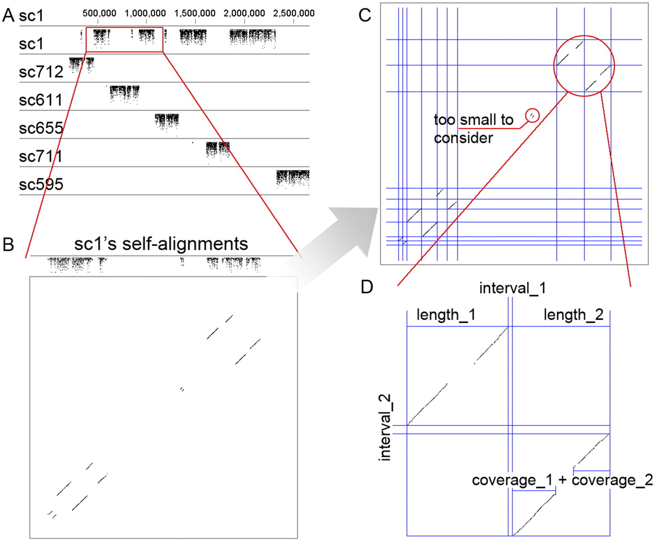 A schematic diagram showing the algorithm used for detecting tandem alleles. The dot plots (A) and (B) show the self-alignments. An algorithm is used to slice the alignment panel into small cells based on the coordinates for the ends of alignment portions (C). A pair of tandem alleles are detected by the algorithm and shown in detail (D), where length_1, length_2, interval_1, interval_2, coverage_1, and coverage_2 are adjustable parameters used to detect potential cases of tandem assembled alleles.