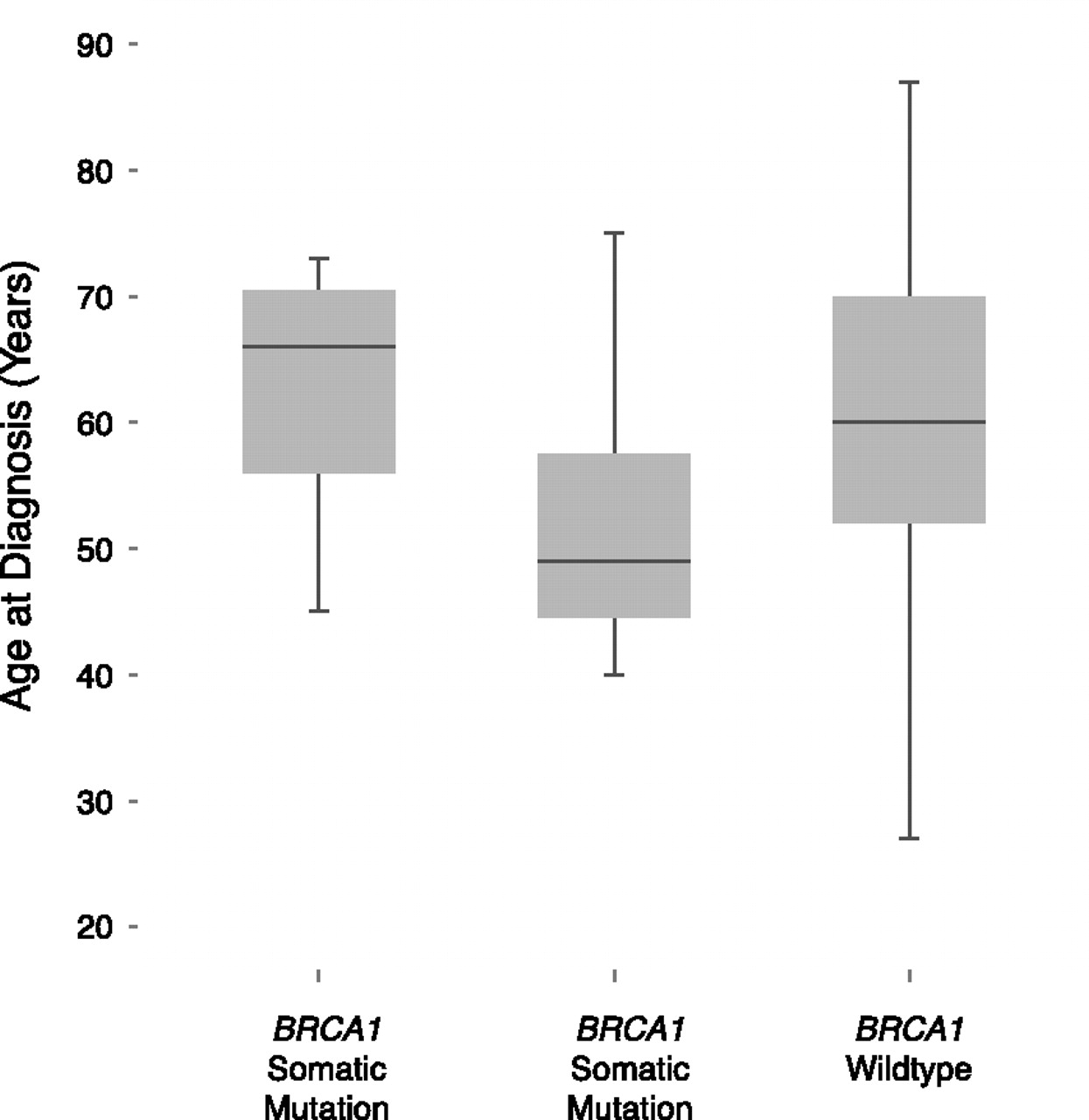 BRCA1 variant status versus sample age of diagnosis for the OV data set. A boxplot of the age of diagnosis of 315 OV patients grouped by their BRCA1 mutation status. Germline BRCA1 variant status is correlated with a lower age of diagnosis via the CCT (P = 2.456 × 10−5).