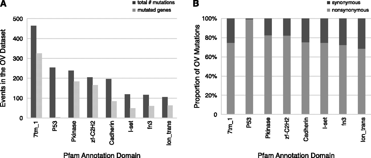 Pfam domains affected by OV mutations. (A) A histogram of the most highly mutated domains in the OV data set next to the number of genes affected in each domain. (B) A stacked bar-graph where the value 100% represents the total number of mutations in a particular Pfam domain. Lighter and darker sections of the bars represent which proportions of the total mutations are nonsynonymous and synonymous, respectively.
