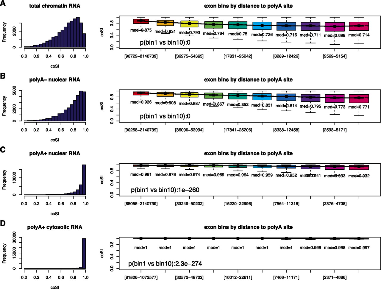 Histogram of coSI values (left) and boxplots of coSI values in bins according to the distance of an exon to the annotated polyA site (intervals on x-axis give minimum and maximum distance in each bin; right) for the total chromatin-associated RNA fraction (A), the polyA− nuclear fraction (B), the polyA+ nuclear fraction (C), and the polyA+ cytosolic fraction (D). P-values were calculated comparing the first and the last bin, using a two-sided Wilcoxon rank sum test. Numbers below boxplots indicate the median value of the according distribution.