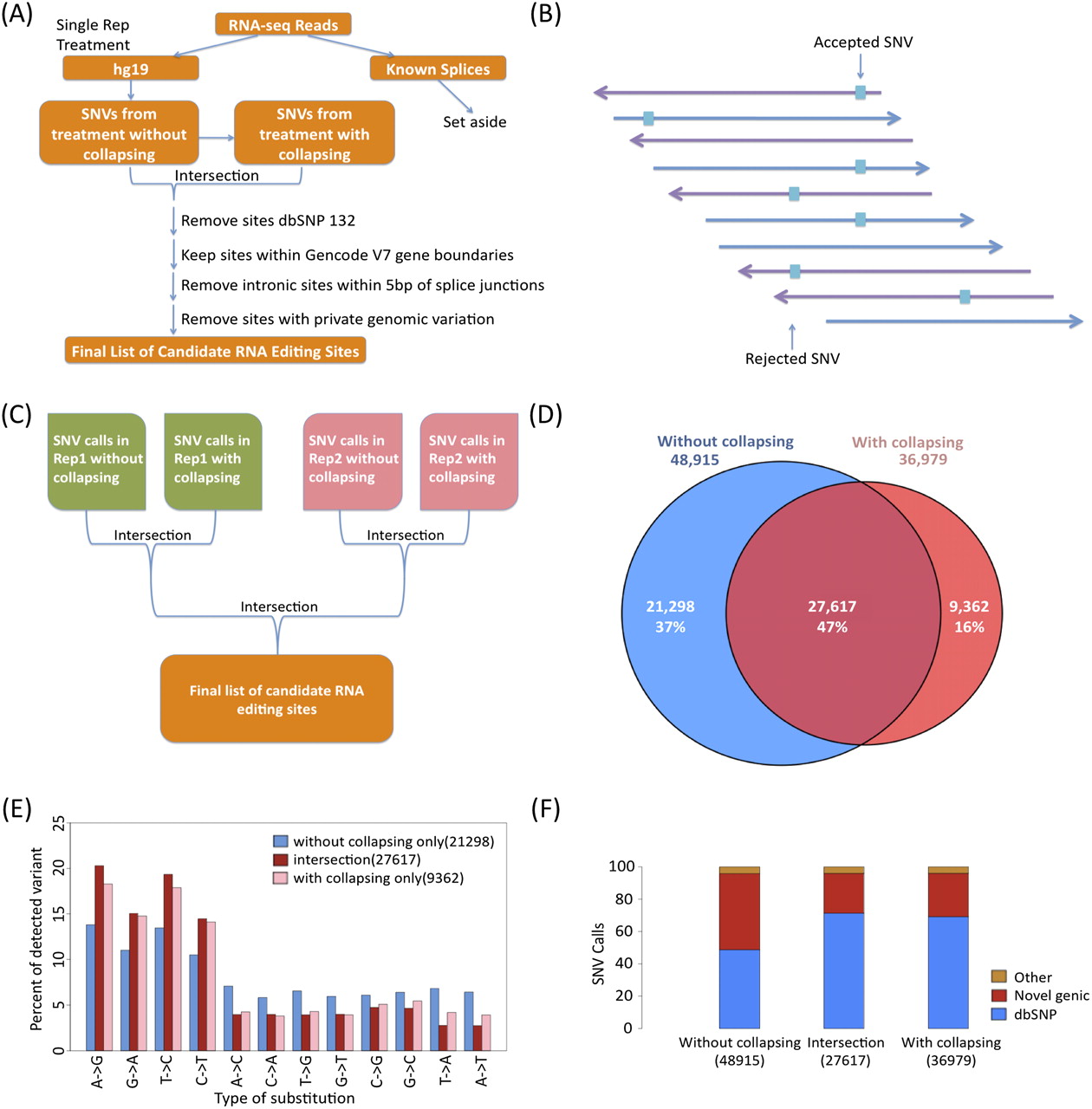 RNA SNV calling strategy. (A) Flowchart of analysis: 75-bp paired-end RNA-seq reads were mapped onto an extended genome (genome + known splice junctions + spikes) using Bowtie. Reads mapping onto splice sites and spikes were set aside, and reads mapping onto hg19 were used to call single nucleotide variants (SNVs). A parallel set of analyses was done using a collapsed set of reads with unique coordinates, and the intersections of SNVs from the uncollapsed and collapsed treatments were obtained. Known SNPs annotated in dbSNP132, sites outside gene boundaries, and intronic sites within 5 bp of splice junctions were removed. For the GM trio, any candidate with evidence of a private genomic variation was also removed. (B) Example of candidate editing site. Purple arrows pointing to the left represent reads on the (−) strand, while blue arrows pointing to the right represent reads on the (+) strand. The blocks represent variants between the reference DNA and the RNA-seq. A SNV is kept when at least three nonidentical reads support the SNV, with a minimum SNV frequency of 10%, and at least one edit per strand. (C) Intersection strategy for two replicates. For cell types with two replicates, the SNVs remaining after collapsing were intersected between the replicates. (D) The number of SNVs remaining after collapsing for the prefiltered sites. Number of SNVs that are only in the uncollapsed set are in blue; the intersection, purple; and collapsed set, red. (E) Collapsing increases the relative amount of A-to-G SNVs and also increases the relative number of transitions. Number of SNVs that are only in the uncollapsed set are in blue; the intersection, purple; and collapsed set, red. (F) The fraction of dbSNP is highest in the intersection of the full and collapsed sets. The relative amount of calls found in dbSNP132, novel genic SNVs, and other SNVs in the uncollapsed set are at the left; the collapsed set, right; and the intersection of the two, middle.
