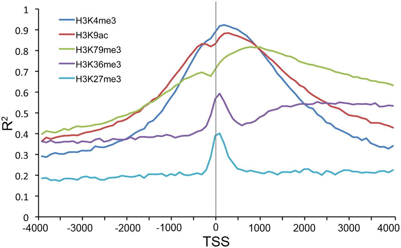 The effectiveness of TF-binding signals for predicting histone-modification patterns around the TSS of promoters. The binding signals of 40 TFSSs are used as the predictors. Both the TF-binding and the histone-modification data are from K562.
