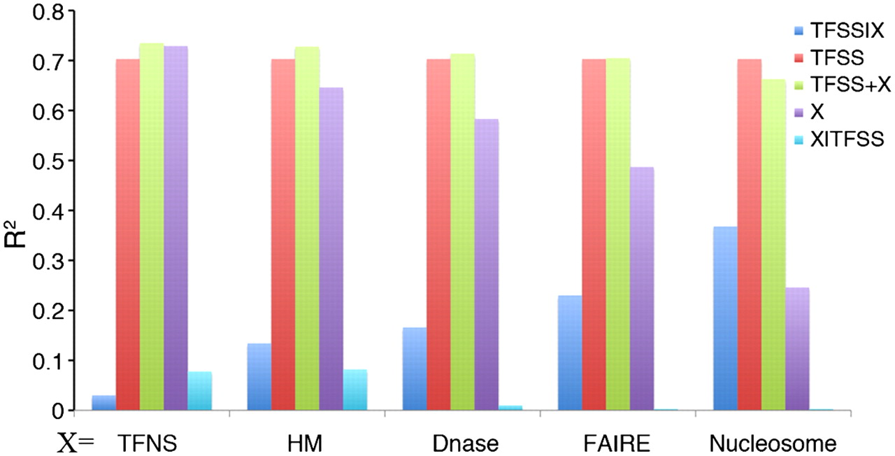 The relationship of the TFSS-binding data with five types of chromatin features for predicting promoter expression. For each type of chromatin feature, we constructed five models to calculate the fraction of variance of promoter expression levels explained by the TFSS alone (TFSS), by each feature alone (X), by a combination of TFSS and feature X (TFSS+X), as well as the additional variance explained by TFSS after taking feature X into account (TFSS|X) and vice versa (X|TFSS). Feature X represents general transcription factors (TFNS), histone modifications (HM), DNase signal, FAIRE signal, or nucleosome occupancy. CAGE expression data in Poly A+ RNA extracted from K562 whole cells were used in the calculation.