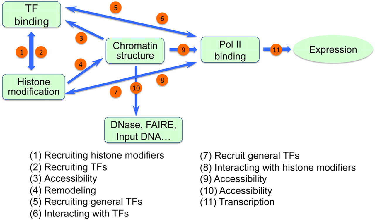 Regulatory mechanism of TF binding, histone modification, and other chromatin features on gene expression.