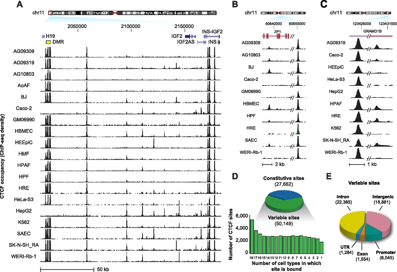 CTCF in vivo binding exhibits widespread plasticity. (A–C) Constitutive and variable CTCF sites. (A) The H19/IGF2 imprinted locus in multiple human cell types. Note the total silencing in two cell lines of the seven CTCF sites in the differentially methylated region (DMR; yellow box at left), and the complex pattern of cell-selective CTCF binding flanked by constitutive sites. Location (hg19), chr11:2,015,000–2,184,000. (B,C) Additional examples of variable sites. (D) Genome-wide analysis of CTCF binding in 19 cell types reveals 77,811 distinct binding sites; 27,662 sites are constitutively present in all cell types; 50,149 variable sites exhibiting a wide range of selectivity are present in a subset of one to 18 cell types (below). (E) Genomic distribution of variable sites is similar to constitutive sites (Supplemental Fig. S2A).