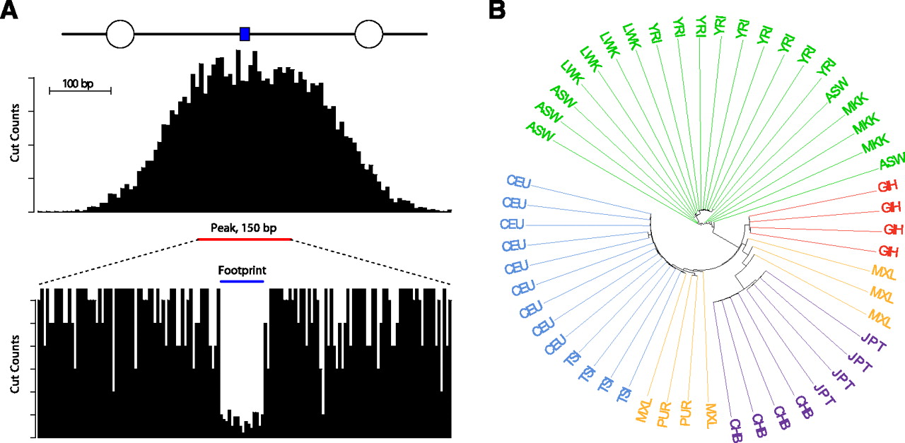 Overview of data used in the analyses. (A) Schematic of the DNase I data. Binding of regulatory proteins to DNA (blue rectangle) results in nucleosome (open circles) displacement and local chromatin remodeling, and these regions are susceptible to cleavage with the endonuclease DNase I. High-throughput sequencing of libraries made from digested nuclei reveals DNase I hypersensitive sites, detectable by increased depth of coverage. Peaks are defined as 150-bp windows centered on the area of maximum cleavage (The ENCODE Project Consortium 2012). Within hypersensitive sites, footprints of regulatory factor binding are observed as decreased cleavage. (B) Unrooted neighbor-joining tree of the 53 unrelated individuals colored by population. Abbreviations are described in Supplemental Table 2.