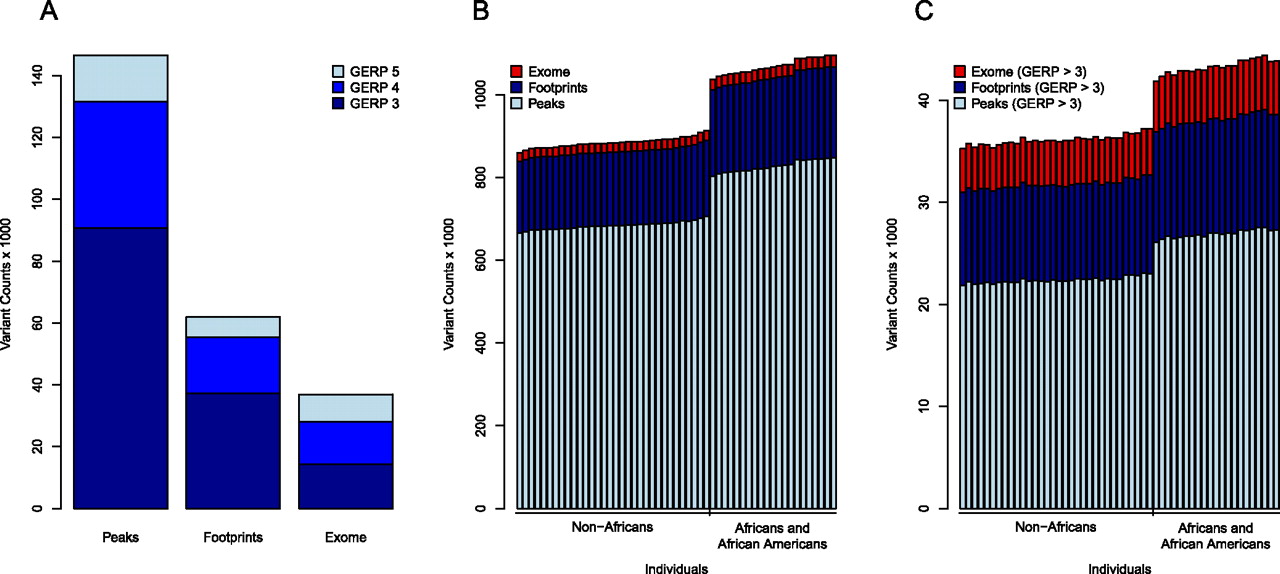 Characteristics of regulatory variation among individuals. (A) Total number of variants in DNase I peaks, footprints, and the exome stratified by GERP score. (B) Distribution of the number of variants per individual in DNase I peaks, footprints, and the exome. (C) Distribution of the number of variants per individual with GERP ≥ 3 in DNase I peaks, footprints, and exomes.