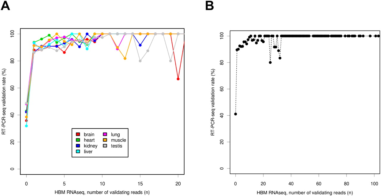 Sensitivity of the RT-PCR-seq method. The RT-PCR-seq validation rates of exon–exon junctions are shown as a function of the abundance of the targeted transcript isoforms. The latter was ascertained by counting the number of validating reads detected in HBM RNA-seq experiments. The results obtained for the seven tissues used in both HBM RNA-seq and GENCODE RT-PCR-seq were considered (brain, heart, lung, testis, liver, kidney, and skeletal muscle) either separately (A) or merged together (B).