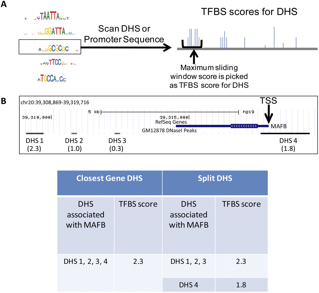 Transcription factor binding site features. (A) DHS and promoter sequences are scanned with PWMs. TFBS scores are log-likelihood ratios of PWM over the background model. A sliding window is used to identify the score for each DHS or promoter. (B) Example to show association of DHSs with genes. Numbers in the brackets are example TFBS scores for the DHS for a specific DHS. Two methods of association were used. In closest gene DHS, DHSs 1–4 from the GM12878 cell line are associated with the gene MAFB. For the TF in consideration, the maximum of all TFBS scores is 2.3. In Split DHS, we separated DHSs overlapping the TSS and other DHSs. This resulted in two features for each gene for each TF.