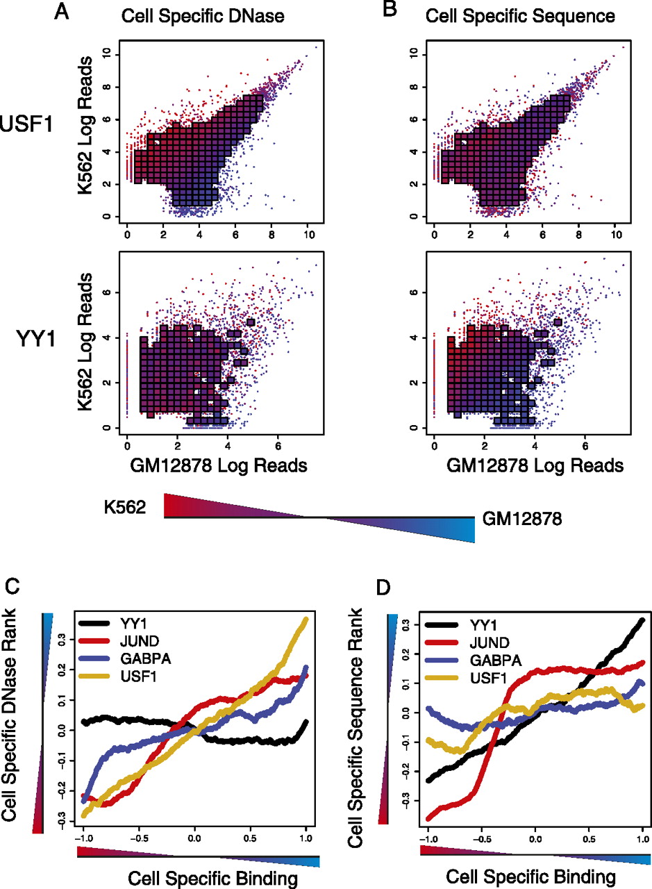 Cell-type–specific TF binding is associated with differential DNase accessibility, sequence signal, or both. (A) Differential DNase accessibility (color) is shown for K562 versus GM12878 with respect to cell-type–specific binding (x-axis for GM12878; y-axis for K562). Each point represents a single binding site, and if there are a sufficient number of points in a region, their value is averaged and appears as a square. DNase accessibility, as measured by read-counts, for USF1 (top) correlates with cell-specific binding. This contrasts with YY1 (bottom), where DNase accessibility is evenly distributed across cell-type–specific and nonspecific peaks. (B) Differential sequence preference (color) is shown for K562 versus GM12878. k-mer SVM models are learned from K562 and GM12878 binding sites, and their differential scores are shown by color gradient. For YY1, but not USF1, we see that the differential k-mer SVM scores distinguish cell-type–specific binding sites. (C) Binding sites with differential TF occupancy also have differential DNase accessibility. Each line represents a TF that has been assayed in GM12878 and K562. The x-axis plots a ranking from the most K562-specific binding site to the most GM12878-specific binding sites, based on cell-to-cell log read count ratios, while the y-axis shows the difference in DNase-accessibility ranks in GM12878 and K562. The line plot is smoothed using the mean over a window of 500 binding sites. (D) For the same TFs, we plot the difference in K562- and GM12878-specific k-mer SVM score ranks (y-axis) as a function of the ranking of cell-to-cell log read count ratios, from the most K562-specific binding site to the most GM12878-specific binding sites. The line plot is smoothed using the mean over a window of 500 binding sites.
