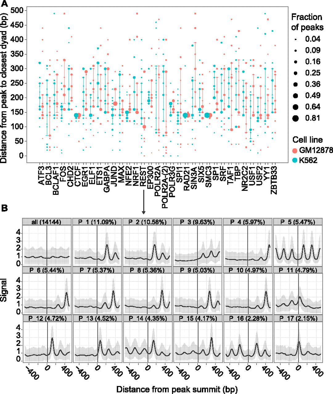 (A) Distribution of distances between the TF binding site and the closest nucleosome for all TFs assayed in both GM12878 and K562. For each TF in each cell line, we used the median signal of the clusters to compute the distance between the TF binding site and the closest nucleosome positioning peak. The area of each dot is proportional to the fraction of peaks of the TF with the given distance between the binding site and the closest nucleosome dyad. The vertical line extends from the first to the third quartile of distances for each TF. (B) Nucleosome positioning patterns uncovered by CAGT around REST binding sites in K562. (Top, left) A traditional aggregation plot, averaging the signal over all 14,144 REST sites. The rest of the panels show the CAGT clusters in order of prevalence, with the percentage of REST peaks in each shown in the header. Two clusters containing <2% of REST peaks each are omitted from the figure. Note the large diversity of nucleosome positioning shapes, with distances between the binding site and the closest nucleosome positioning peak varying widely from 10 bp (P_17) to 300 bp (P_4).