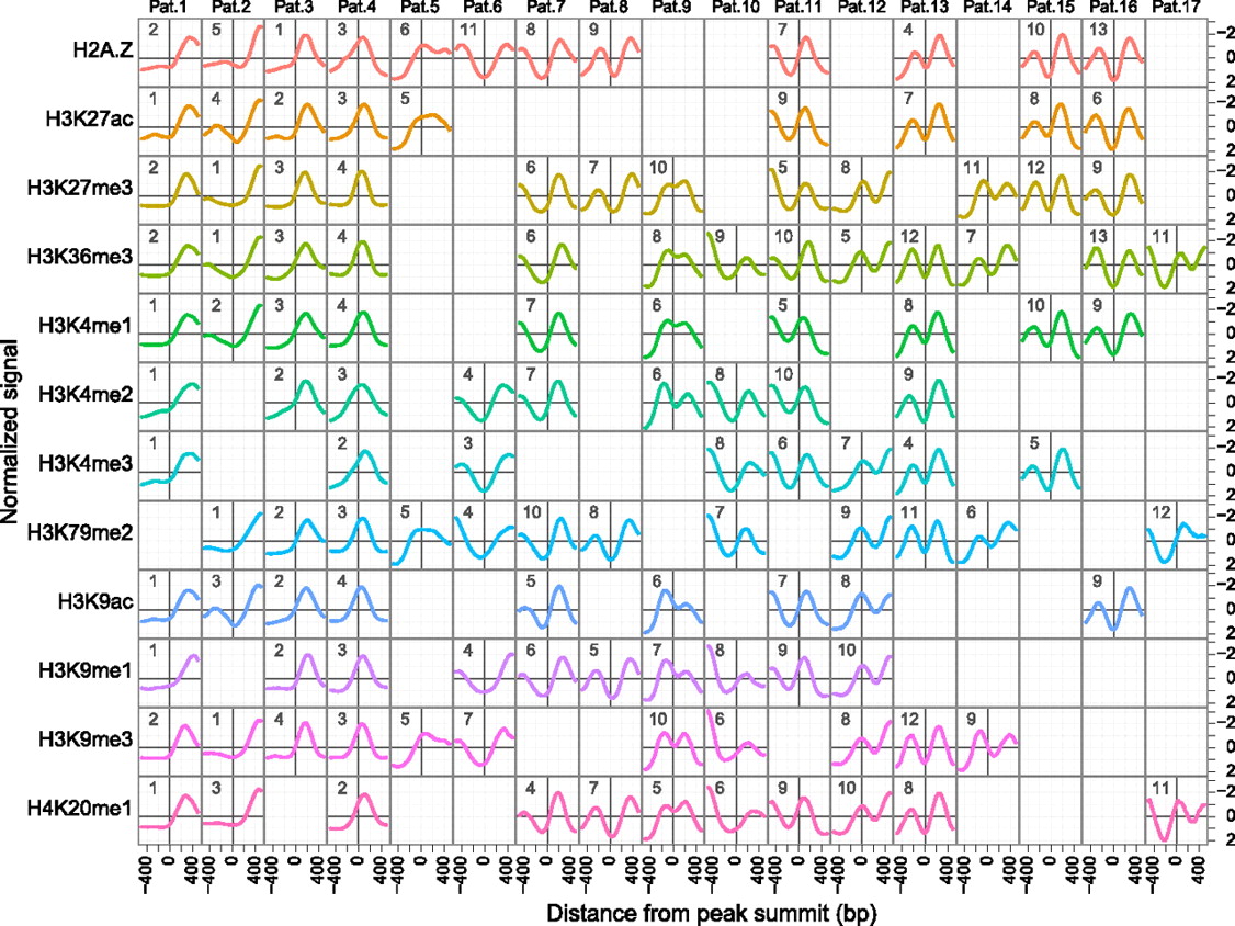 CAGT meta-clusters for all histone modifications across all binding proteins in all Tier 1 and Tier 2 ENCODE cell lines. Each row contains the clusters discovered by CAGT in the merged data sets for the corresponding modification. The clusters for each mark are numbered according to their size, with cluster 1 for each mark containing the most TFBSs (see the numbers at the top, left corner of each shape plot). Clusters for different modifications are arranged to bring similar shapes in the same column. Five columns containing three or fewer shapes are not shown.