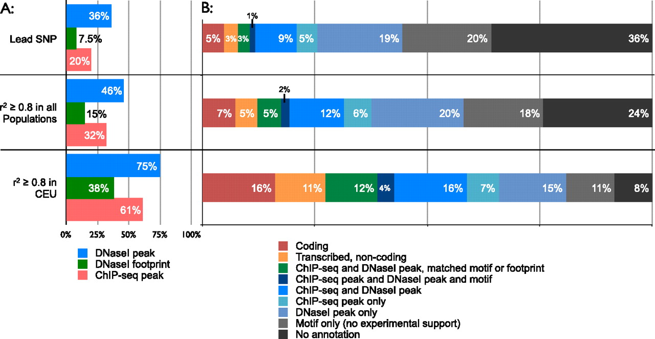 Proportions of associations for different types of functional data. Proportions are shown for individual assays (A) and for all sources of evidence combined (B). Proportions are presented separately for lead SNPs and SNPs in strong linkage disequilibrium (r2 ≥ 0.8) with a lead SNP. For each association, we determine which SNP in the LD region is most strongly supported by functional data in order to generate the proportions in panel B. We separately consider SNPs in strong linkage disequilibrium with a lead SNP in all HapMap 2 populations, and SNPs in strong linkage disequilibrium with a lead SNP in the CEU population. For the latter case, we use only associations identified in populations of European descent, and show that we can map 80% of these associations to a functional SNP supported by experimental ENCODE data.