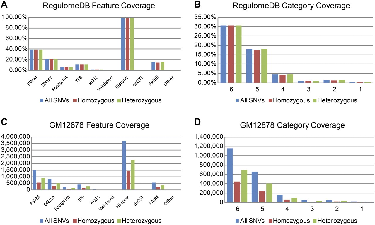 Incidence of SNVs in features and categories. Average percent count of SNVs in each genomic feature (A) and in each RegulomeDB category (B). Although the differences between homozygous and heterozygous SNV counts are small, they are nevertheless significant (P < 5 × 10−15). Actual SNV count in features (C) and categories for the cell line GM12878 (D).