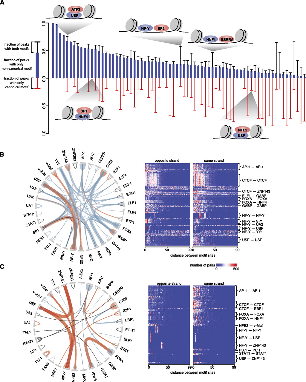 Interactions between TFs. (A) Different modes of interaction between TFs are shown. Each bar indicates the canonical TF and one noncanonical TF whose motifs were identified in the same ChIP-seq data set, and the red, blue, and black segments of the bar indicate percentage of peaks in the ChIP-seq data set that contain only canonical motif sites, only noncanonical motif sites, or both. Cartoons depict examples of different models for TF-TF interactions. (B) Circos plot (Krzywinski et al. 2009) on the left depicts pairs of motifs (connected by an arch) with significant distance preferences between their sites. The thickness of a connection is proportional to the normalized frequency of the pair. A connection is depicted as blue, black, or red when the motif pair is discovered in different data sets, the same data set, or both, respectively. The heat map on the right shows the distributions of distances between motif pairs. Each row is a motif pair in a particular ChIP-seq data set, and each column represents an edge-to-edge distance (from 0 bp to 99 bp). (C) Similar to B except showing motif pairs discovered in repetitive regions.